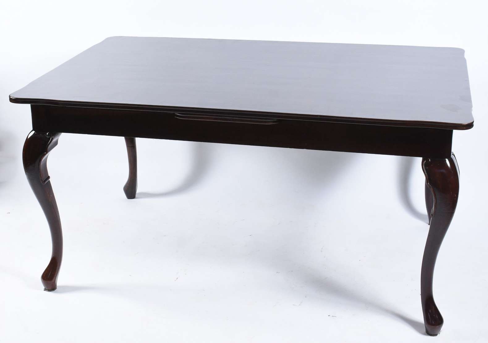 Móvel escrivaninha de madeira nobre, tampo articulado, duas portas na parte inferior com prateleira interna.