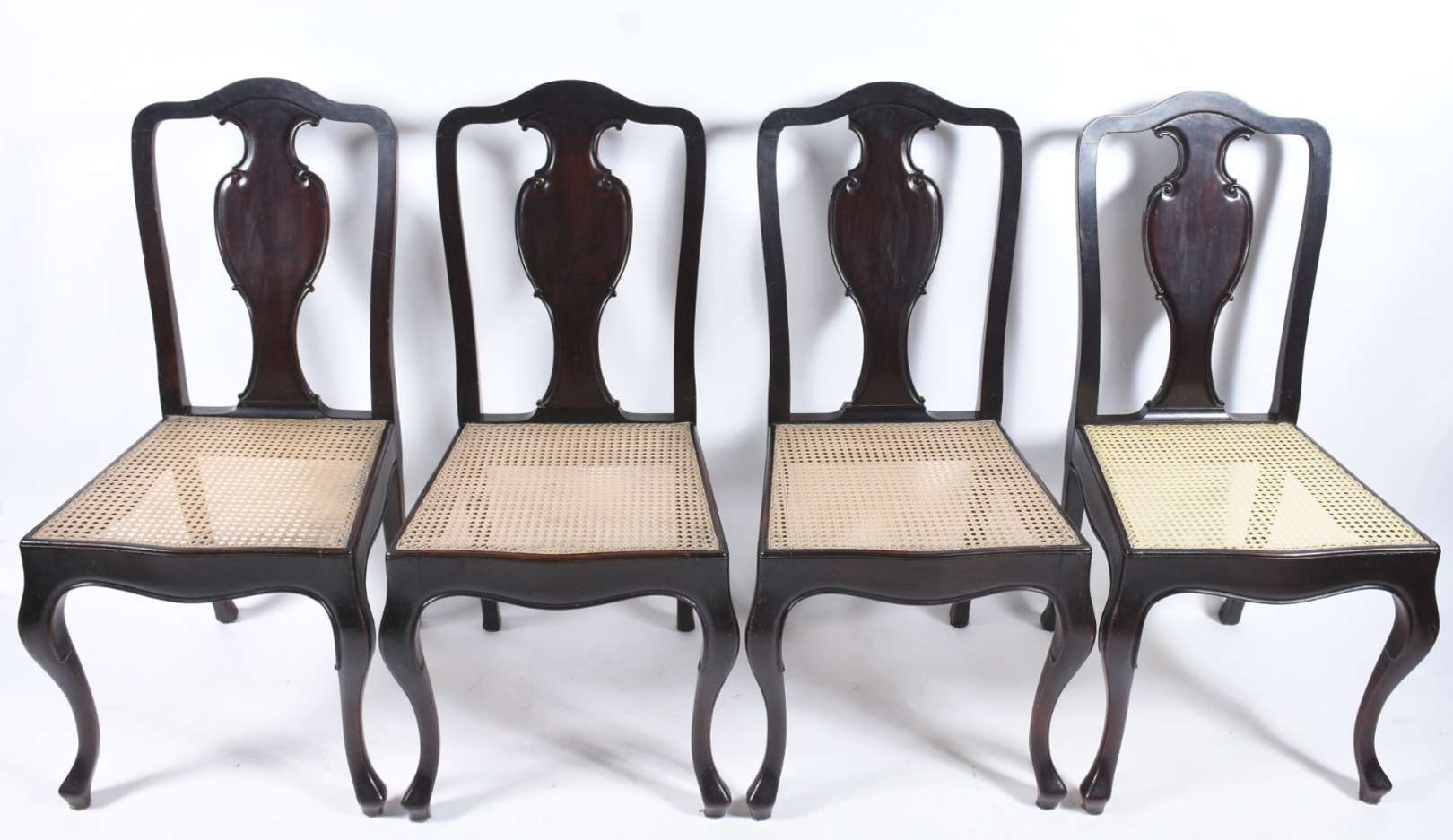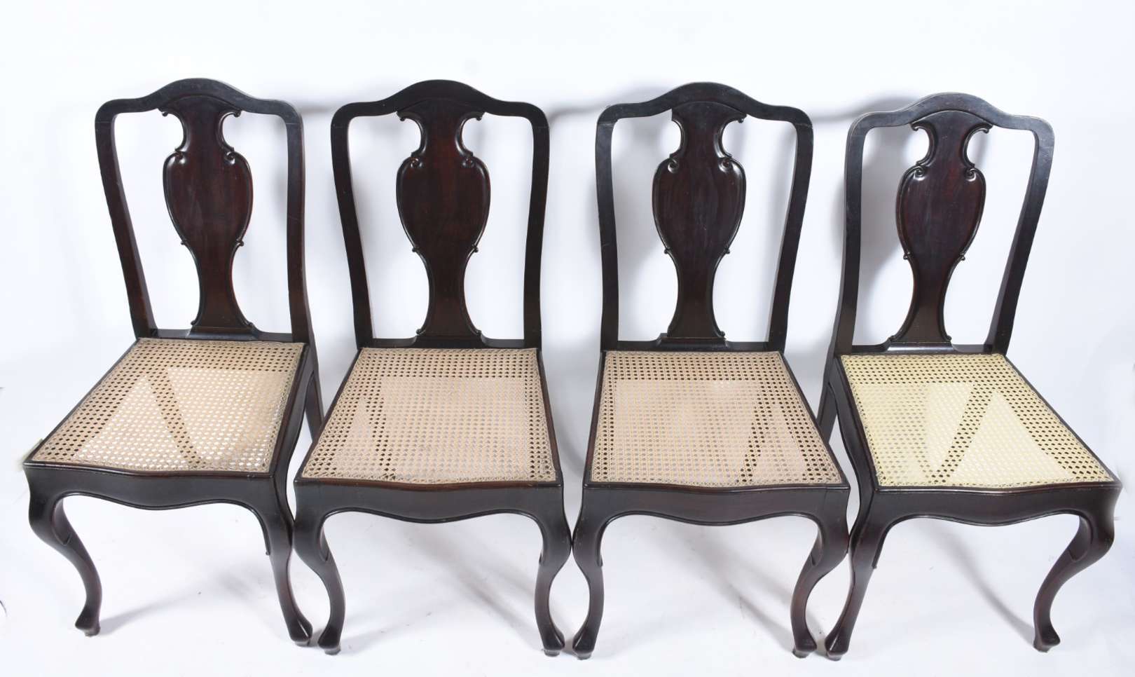 Cadeira de madeira nobre estilo Império, assento de palhinha e encosto com pinos torneados.