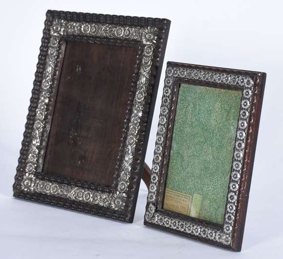 Dois porta retratos de jacarandá com detalhes em prata.