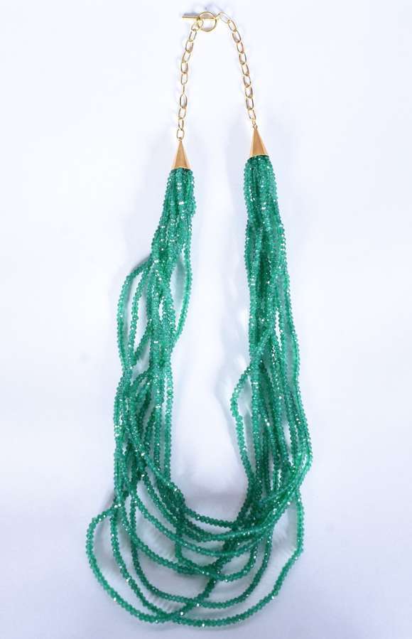 Colar com 9 fios pedras verdes e fecho de ouro 18 k.