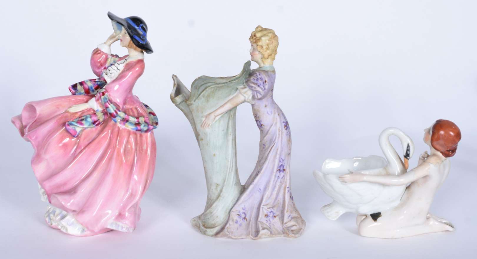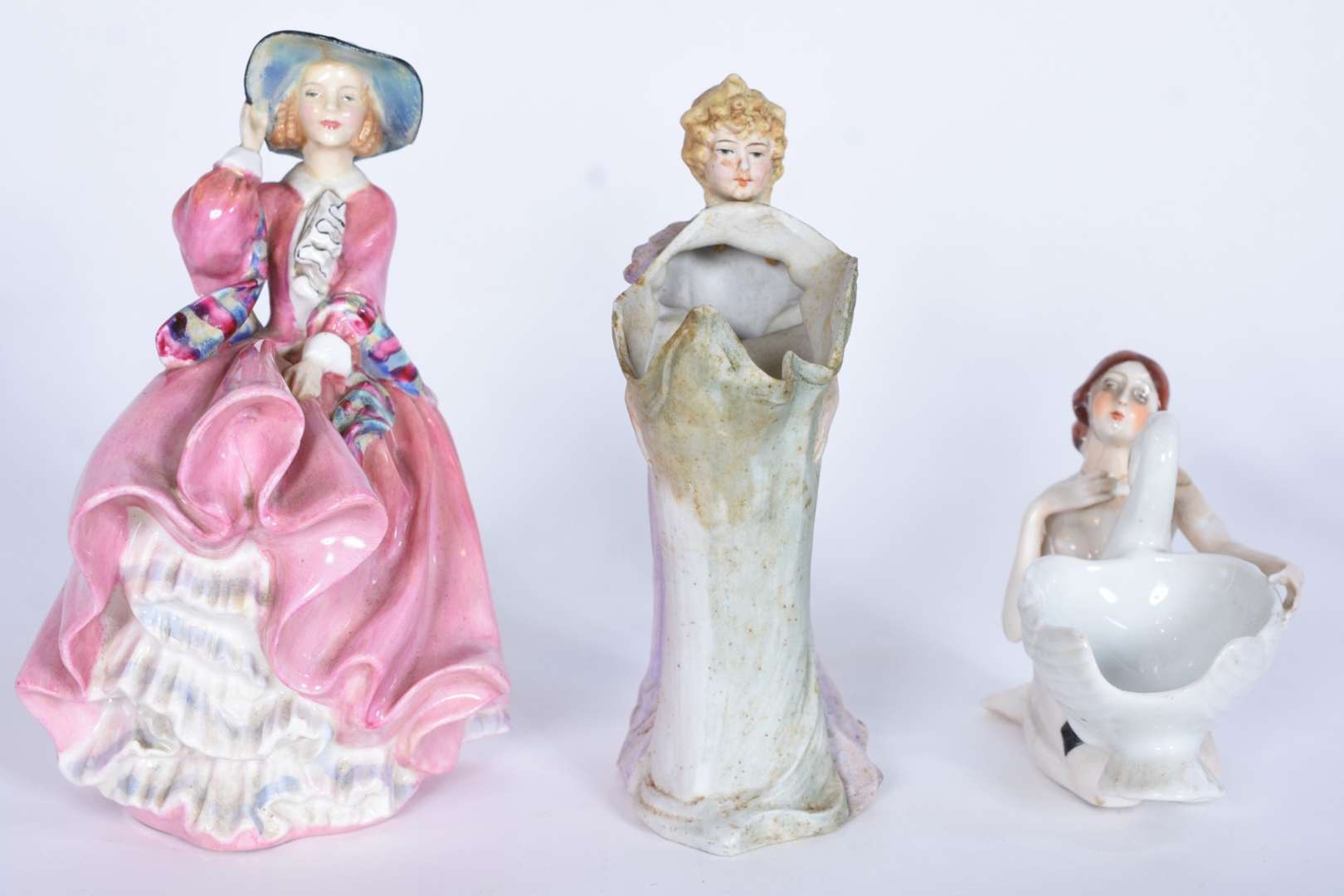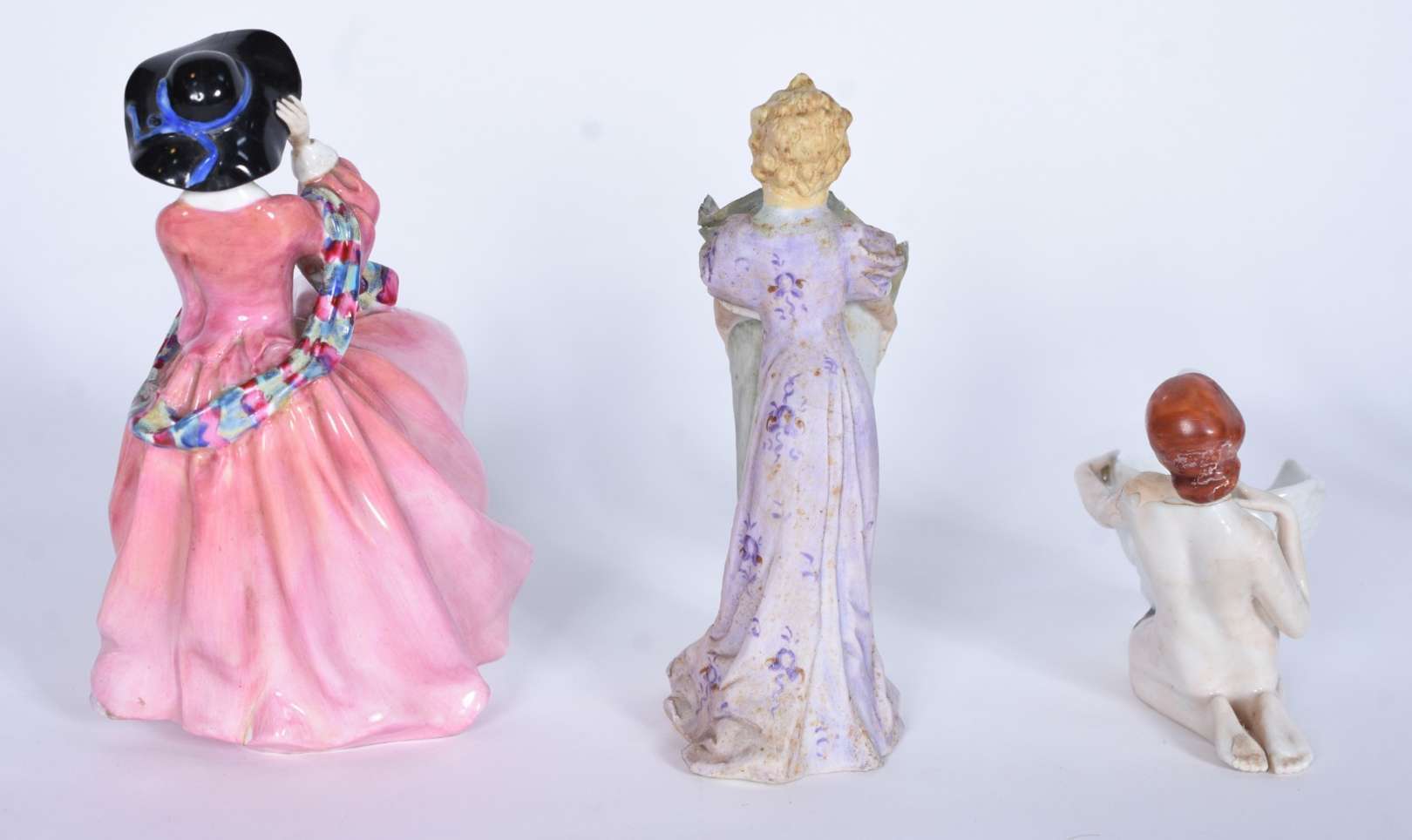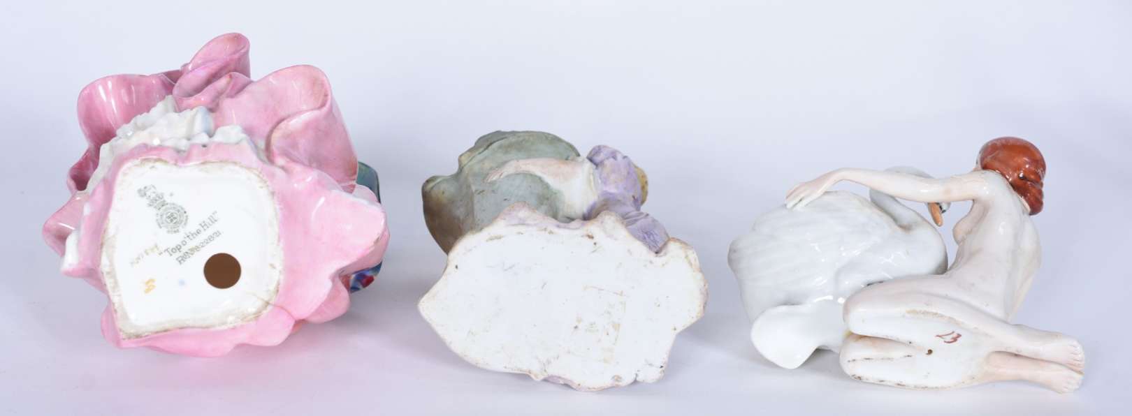 Três estatuetas de porcelana, sendo a maior, inglesa Royal Doulton representando dama de vestido rosa (fio de cabelo na base), e duas menores, sem marcas. As menores com restauro.