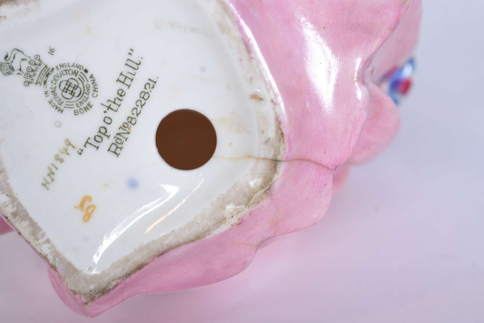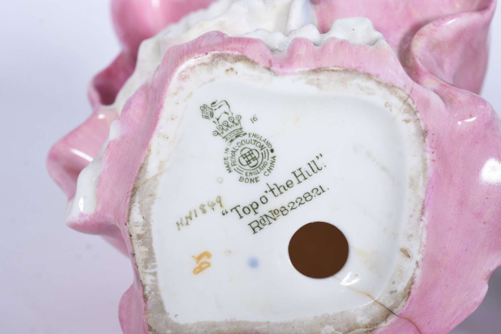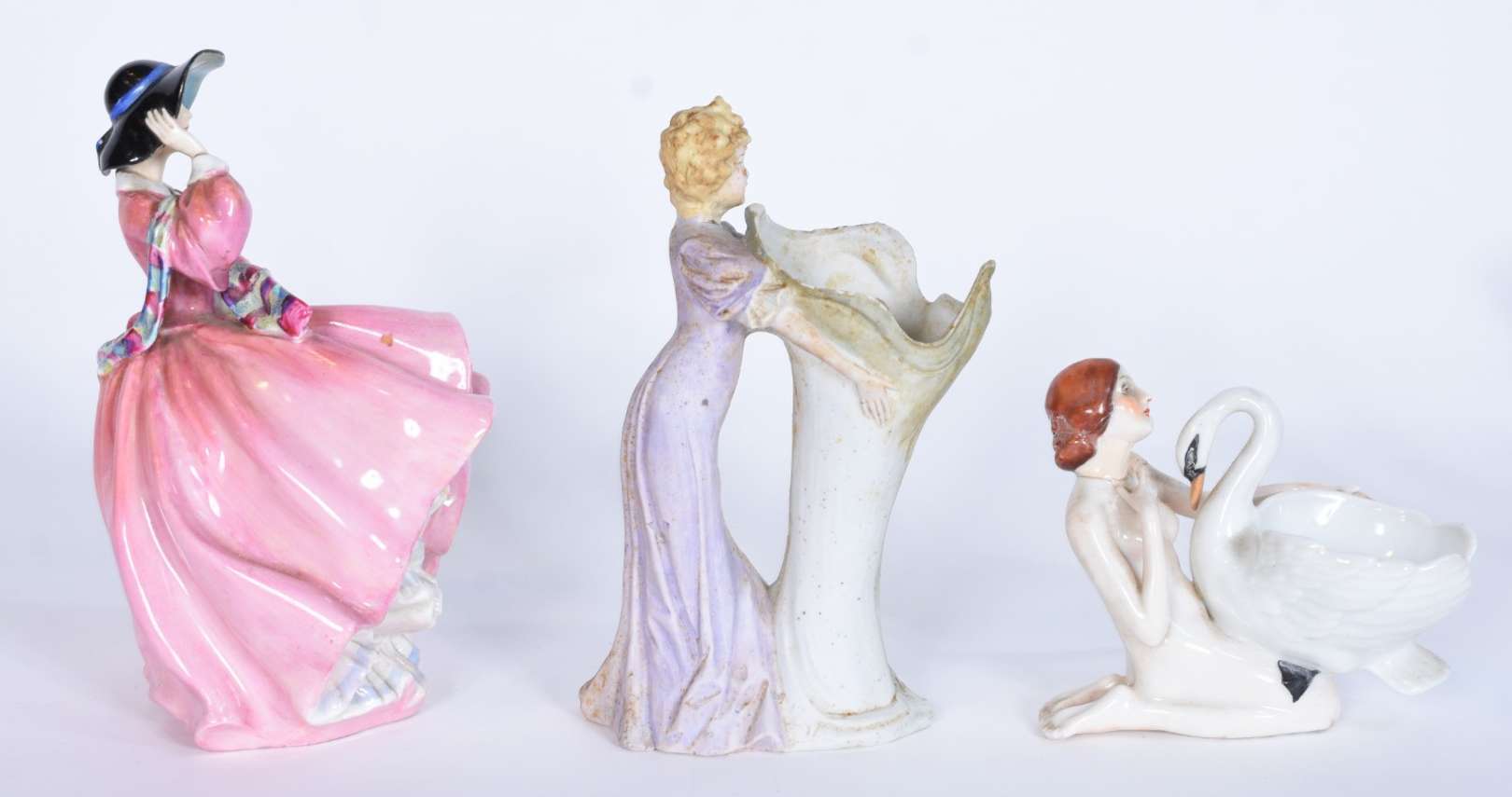 Três estatuetas de porcelana, sendo a maior, inglesa Royal Doulton representando dama de vestido rosa (fio de cabelo na base), e duas menores, sem marcas. As menores com restauro.