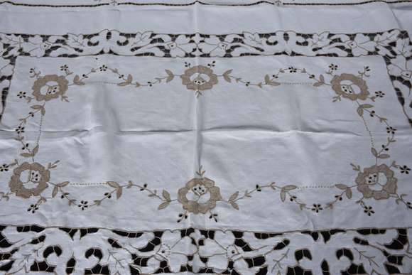 Toalha de mesa de linho bege com bordados e vazados, acompanham 12 guardanapos.
