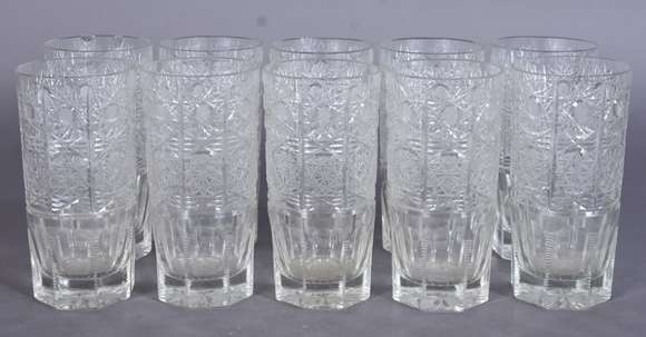 Dez copos longos de cristal lapidado bases facetadas.