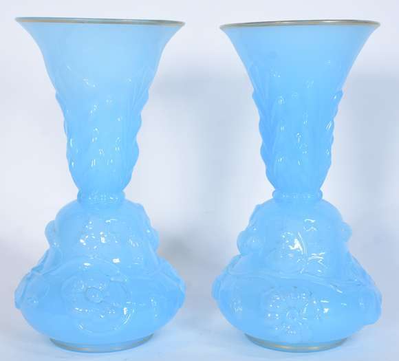 Par de antigos vasos de opalina francesa na cor azul celeste com flores em relevo e resquícios de frisos dourados na ...