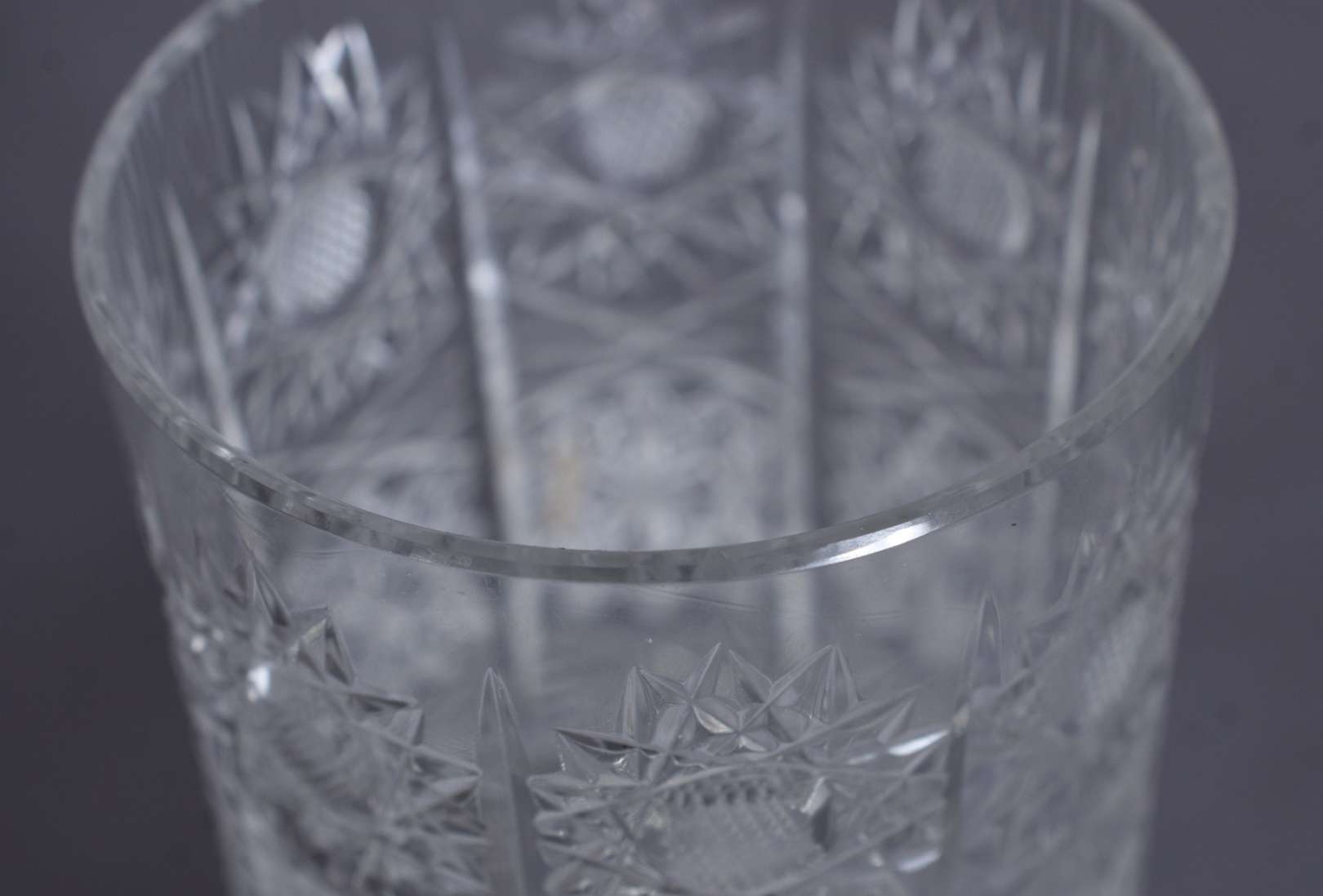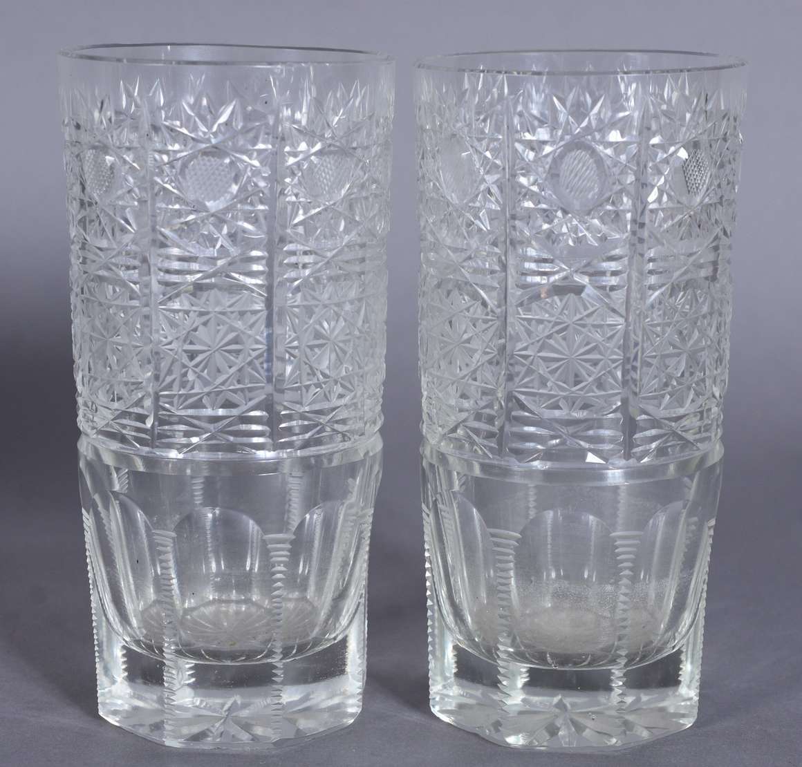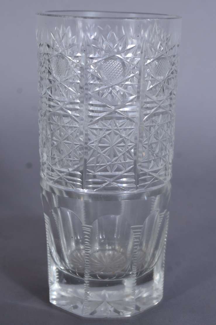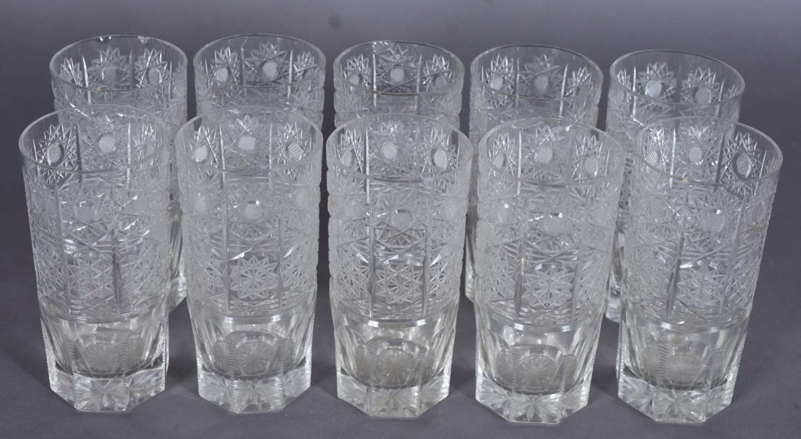Dez copos longos de cristal lapidado bases facetadas.