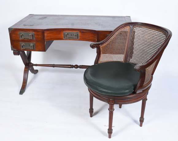 Mesa de escritório de madeira nobre, cinco gavetas com puxadores embutidos estilo "navy", pernas em X ligadas por tra...