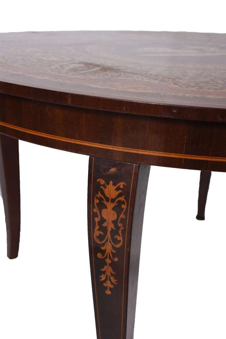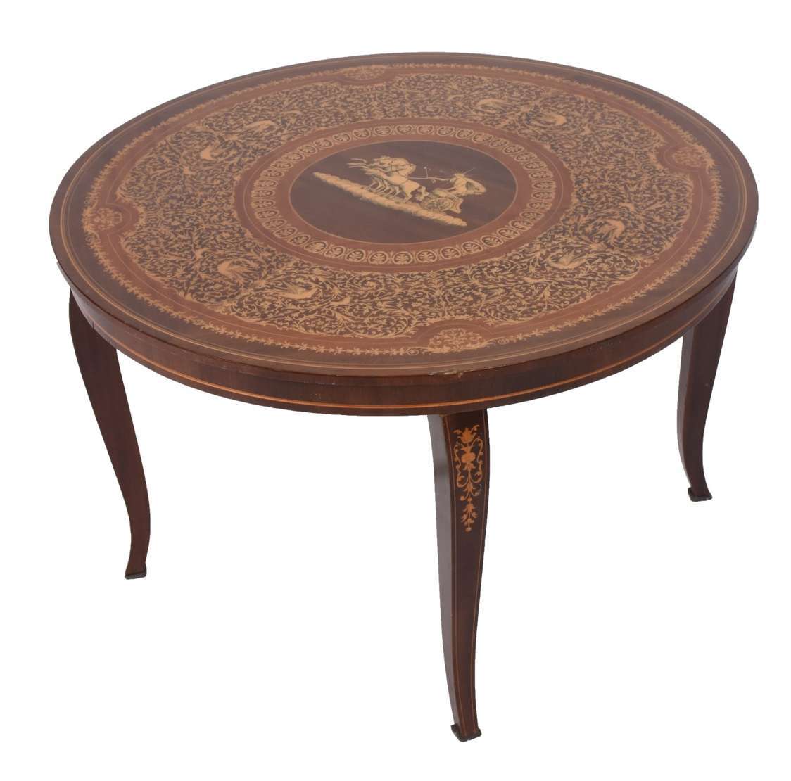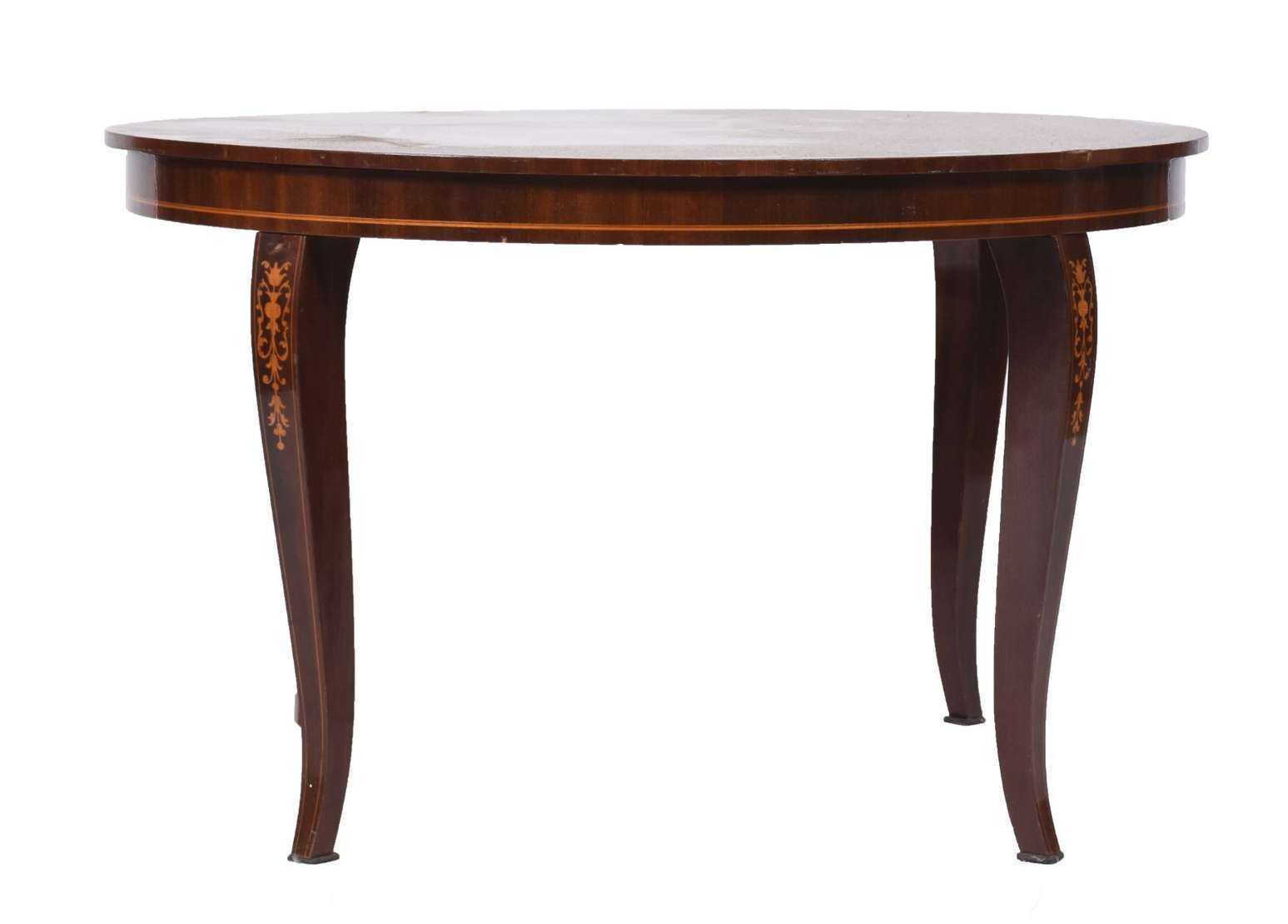 Mesa de centro no feitio oval trabalhada com marqueterie, galeria e detalhes de metal.