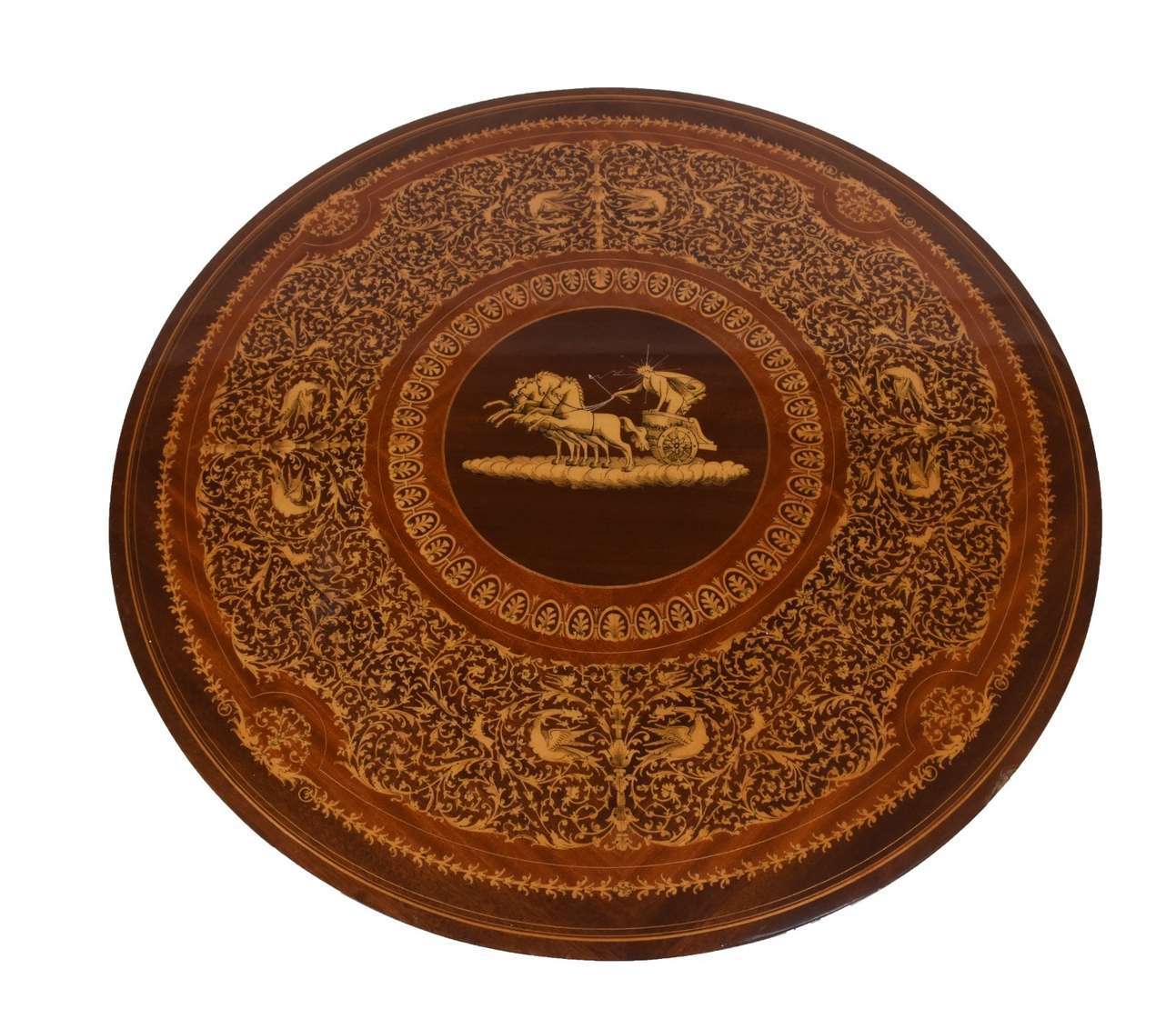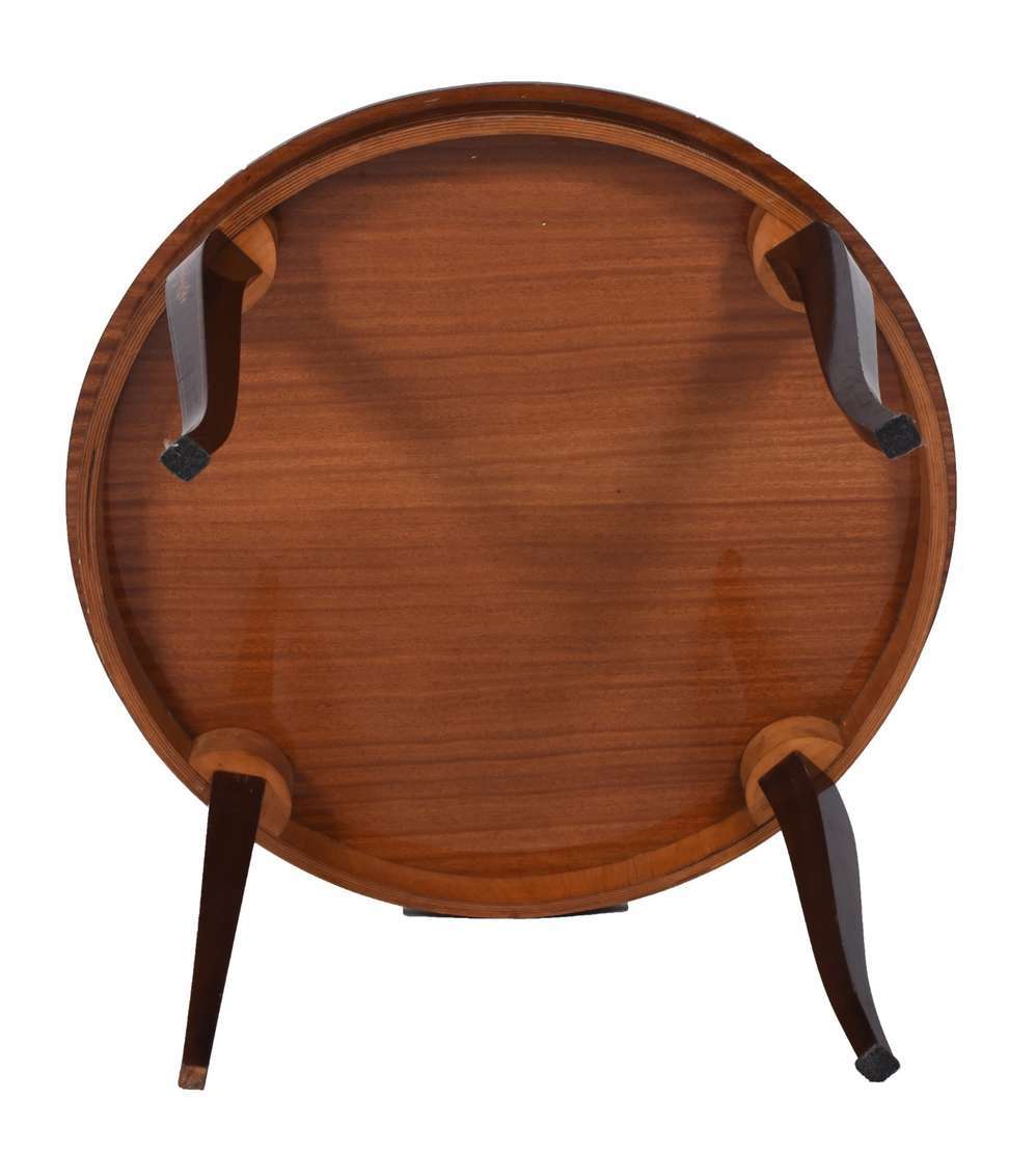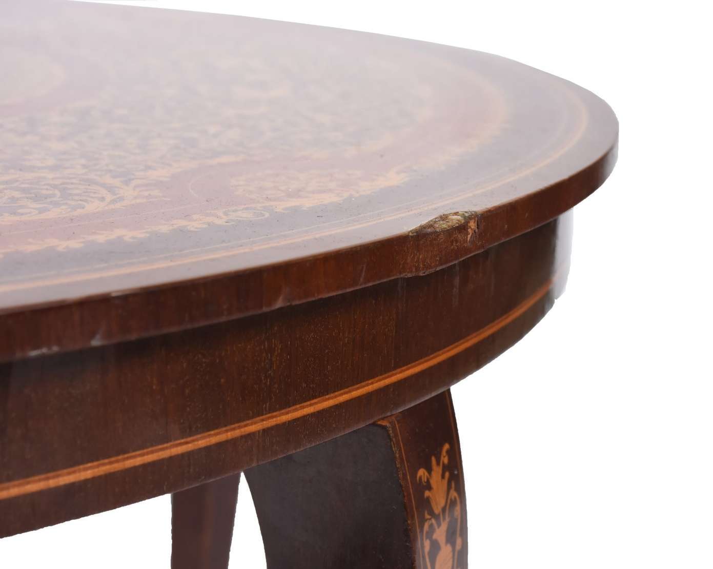 Mesa de centro no feitio oval trabalhada com marqueterie, galeria e detalhes de metal.