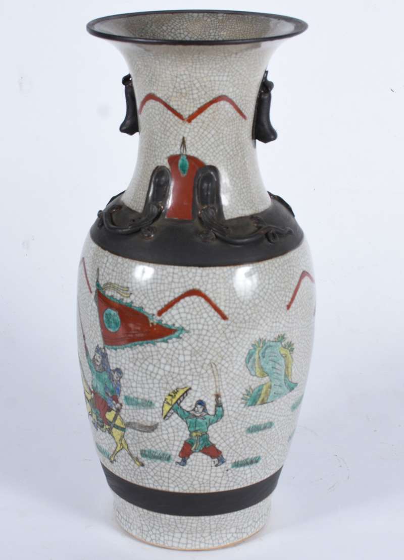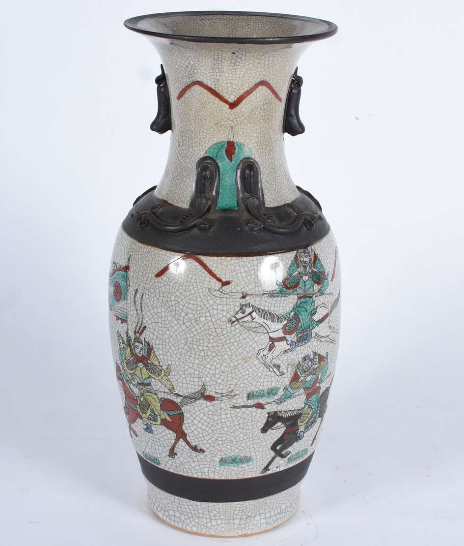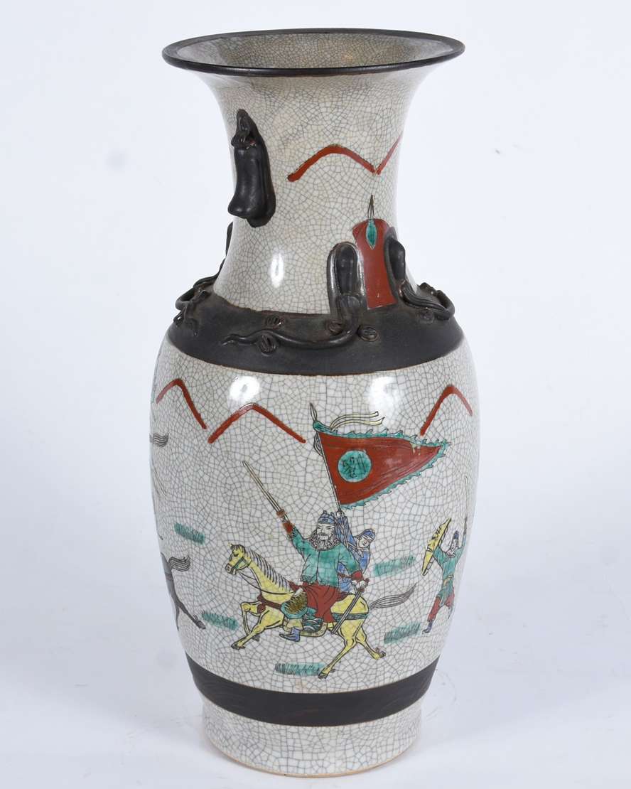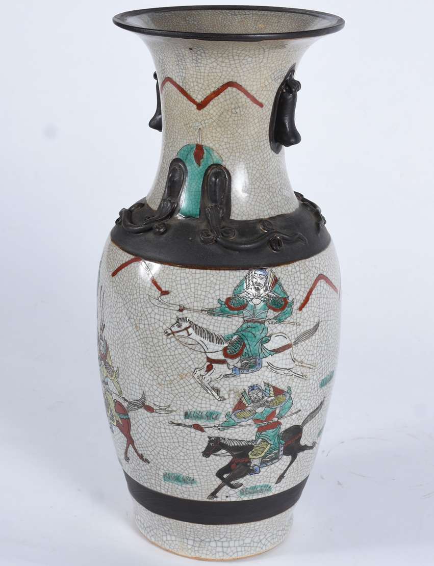 Vaso de faiança com paisagens em policromia, pegas laterais recortadas em tons de amarelo e azul.
