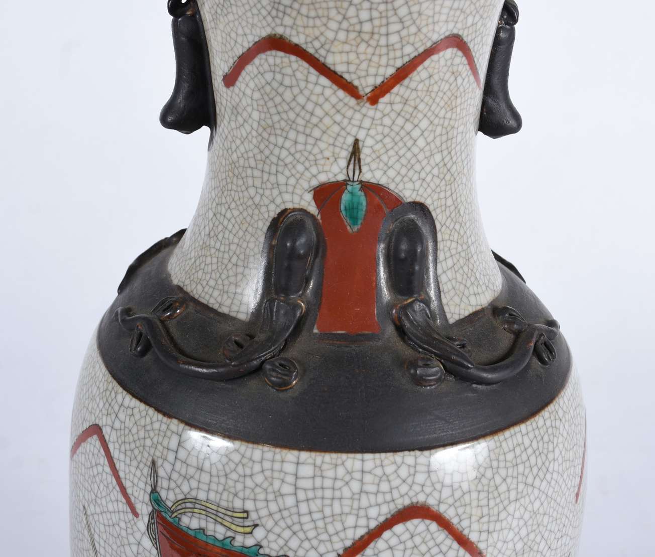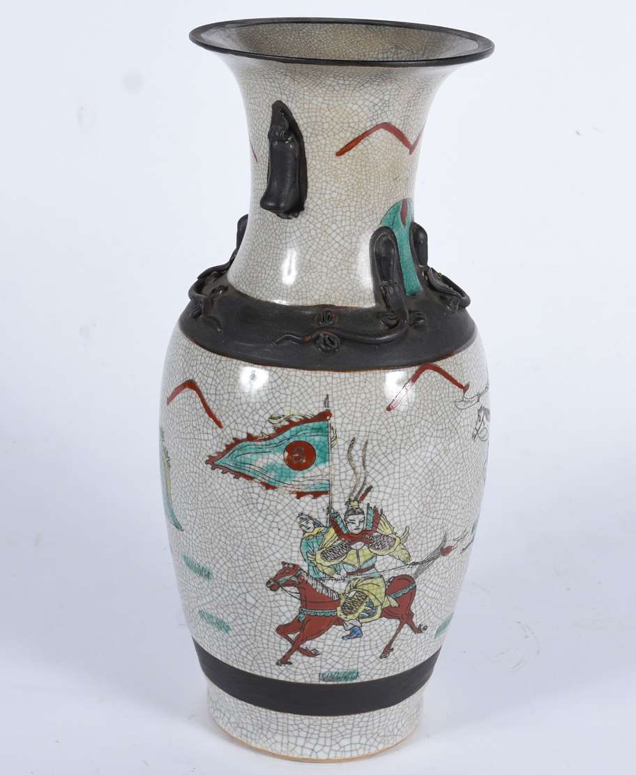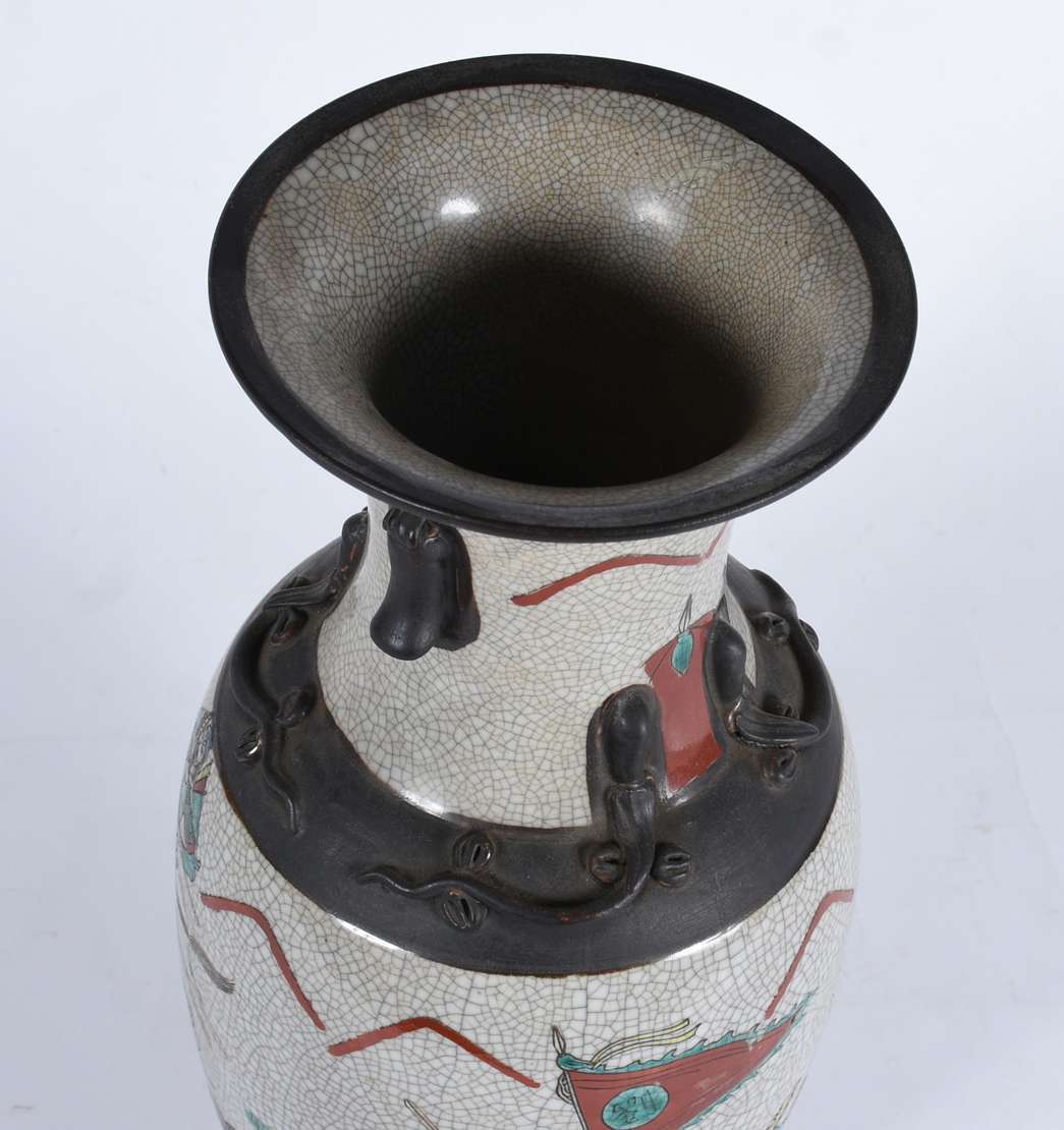 Dois vasos de porcelana europeia, sendo um branco Art Nouveau com alças e desenhos em policromia; e outro mais baixo ...