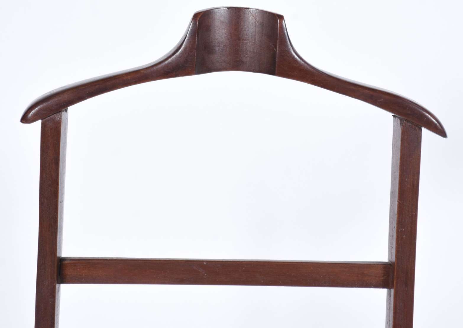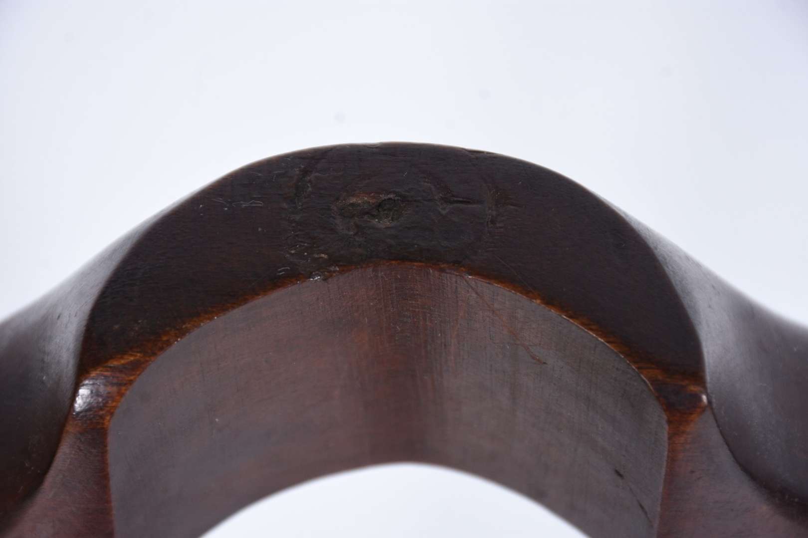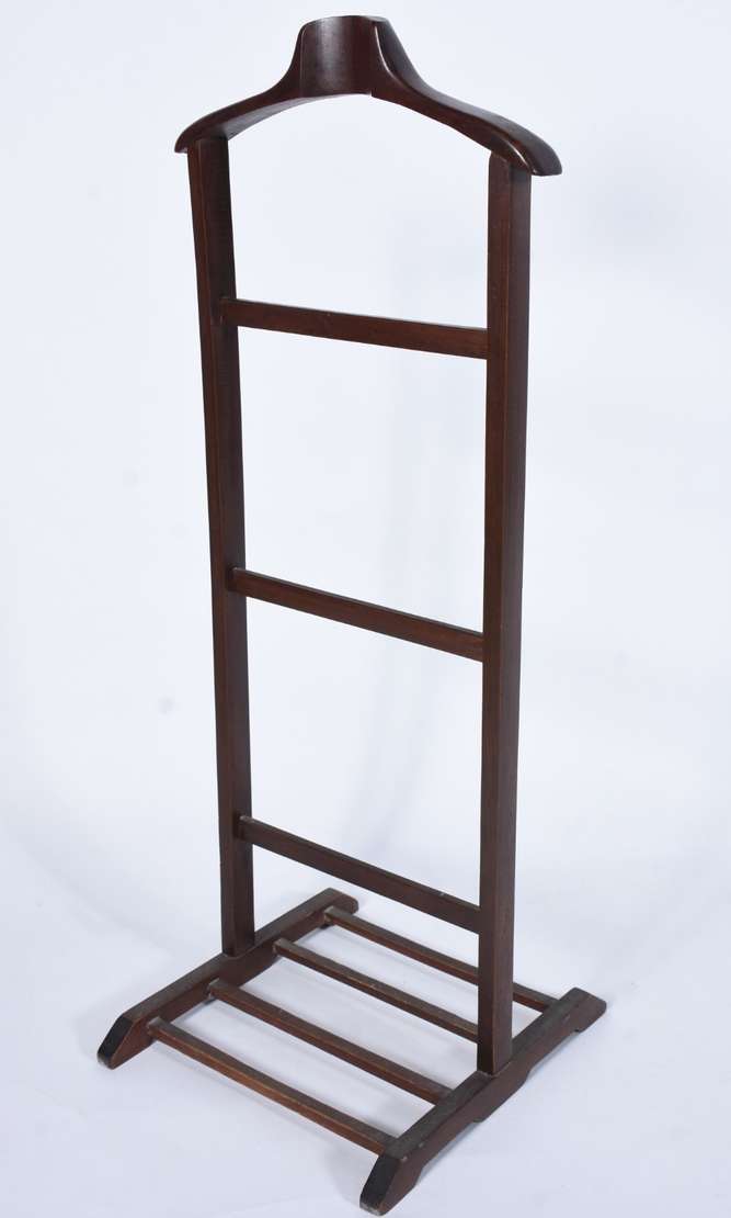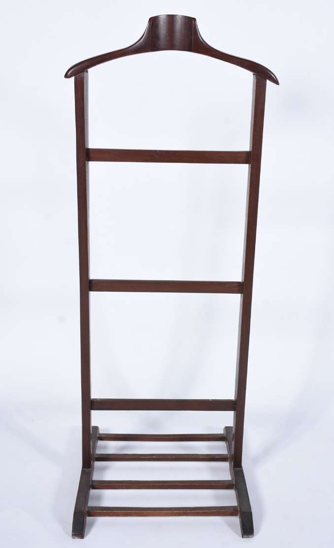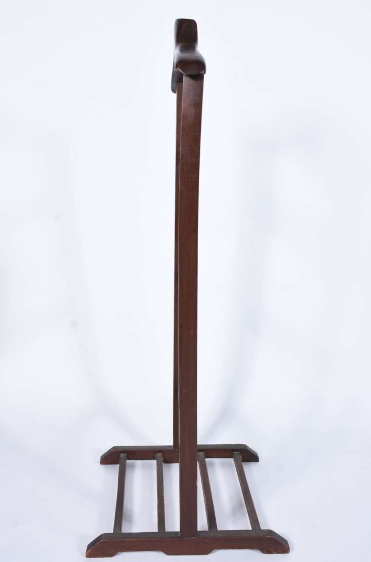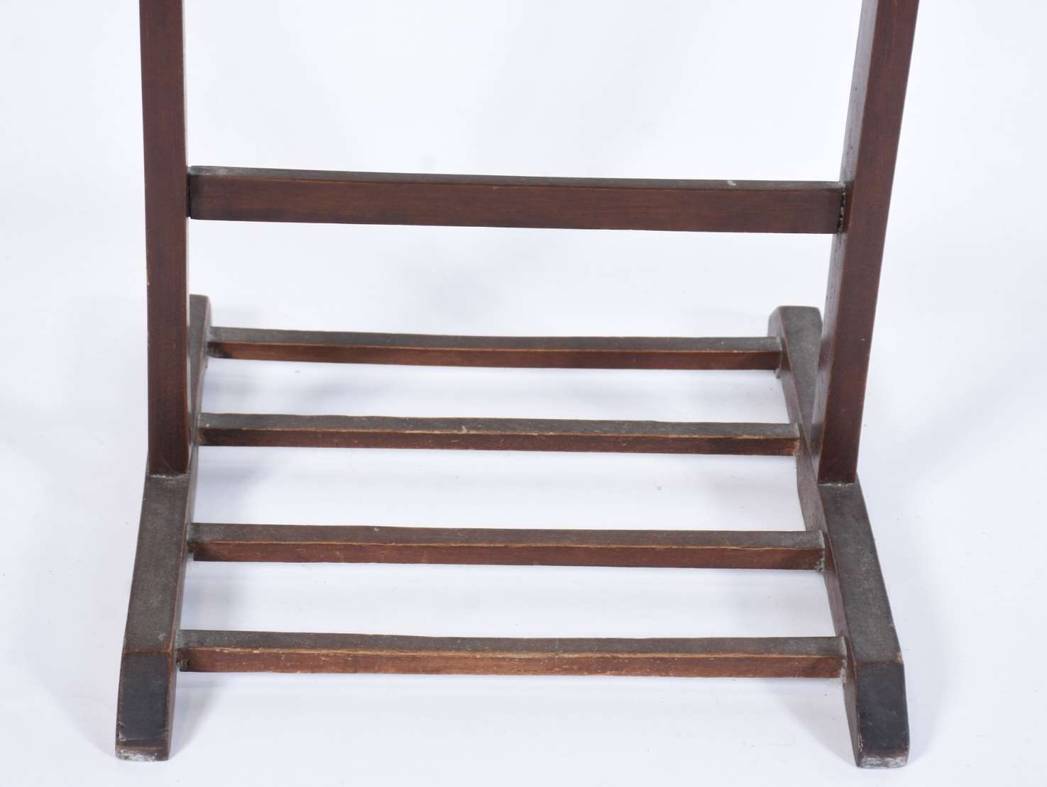 Coluna/cantoneira de madeira, quatro pernas retas ligadas por pequeno platô inferior.