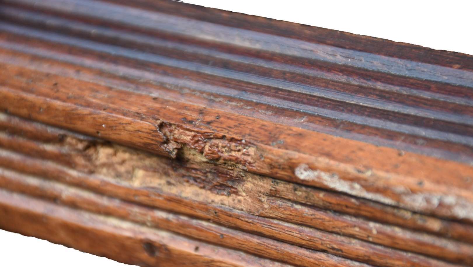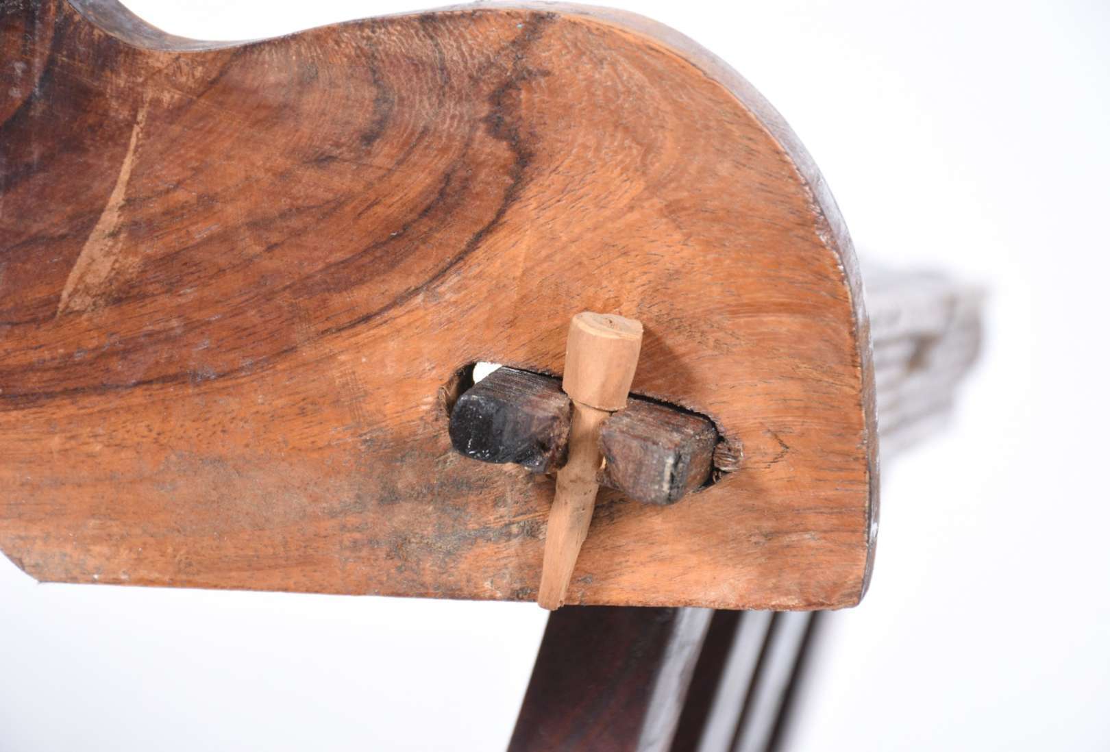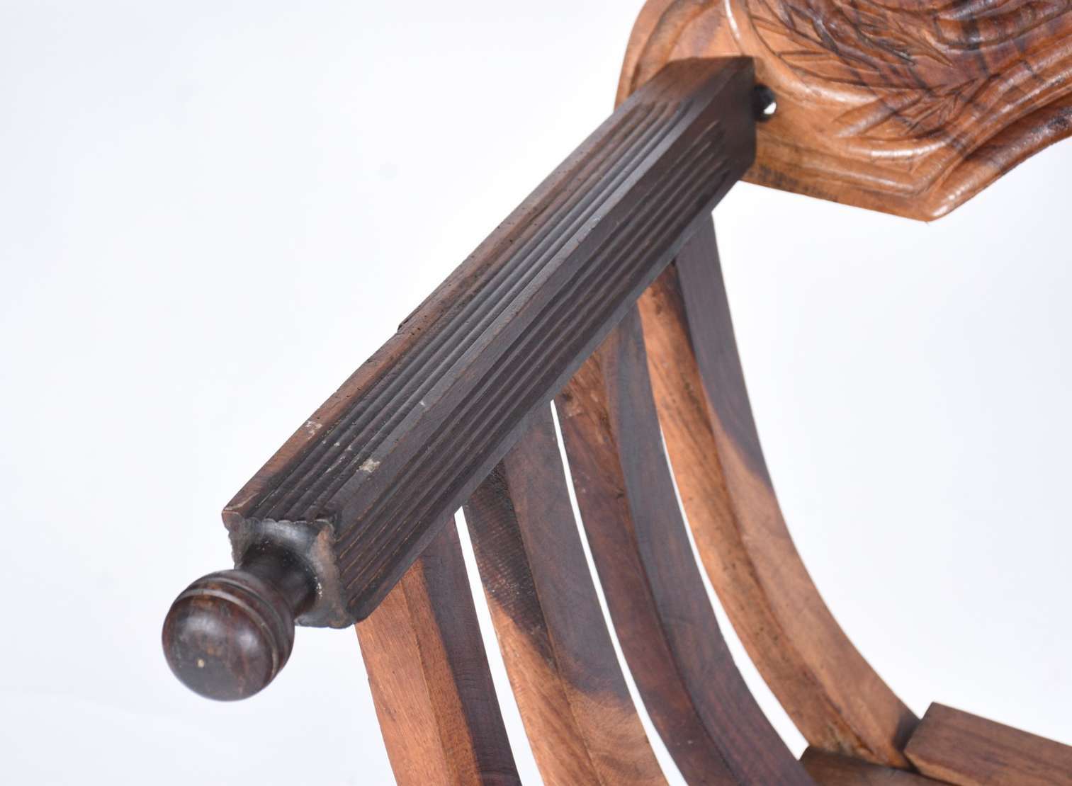 Cadeira de madeira nobre estilo Império, assento de palhinha e encosto com pinos torneados.