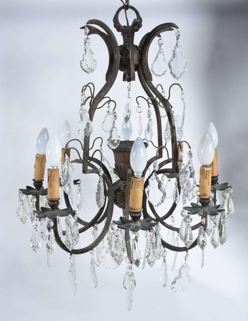 Lustre de cristal para 6 luzes, pingentes lapidados, cúpulas na forma de copos opalinados. Um dos braços colados.