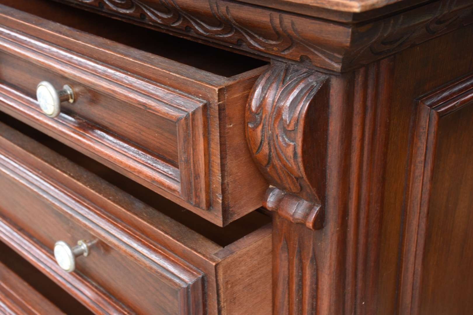 Mesa de encostar de madeira nobre com uma gaveta com saia entalhada, pernas ligeiramente recurvas, encimada por espel...