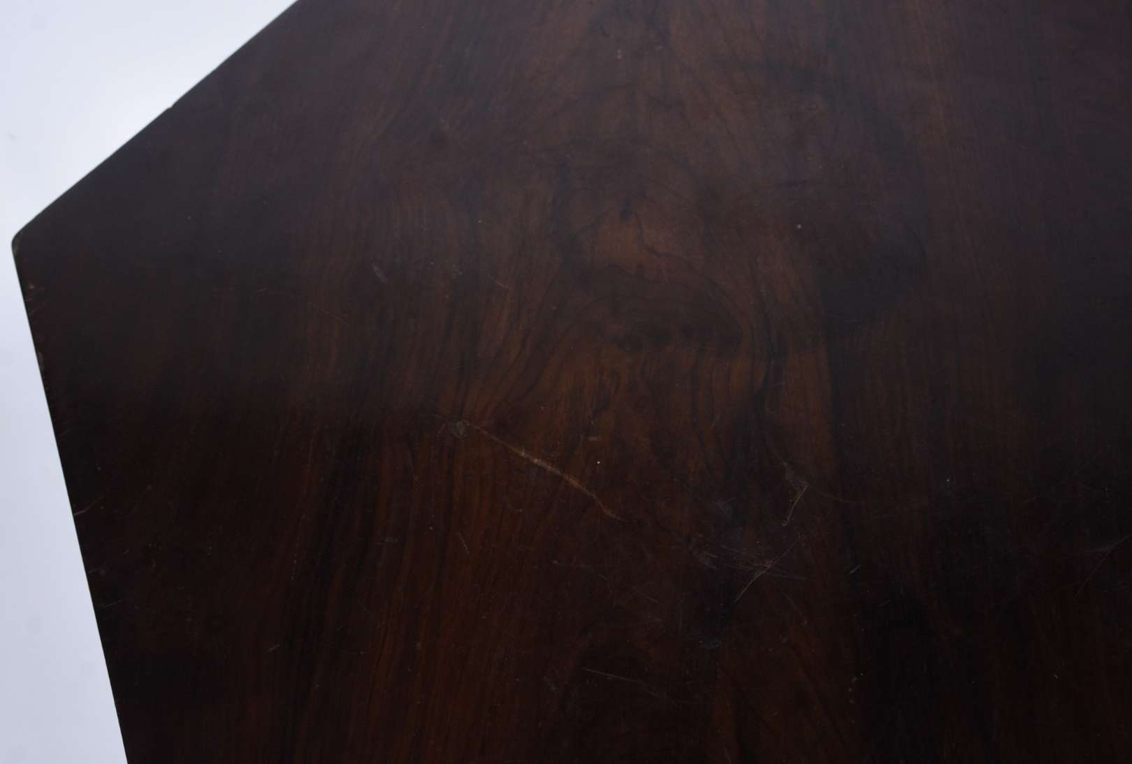 Mesa auxiliar de madeira nobre, tampo articulado com espelho na face interna e divisórias. Pés de pata de animal. Peq...