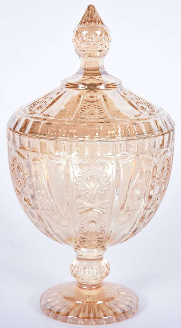 Centro de vidro decorativo na cor laranja com pó de ouro, trabalho em gomos e borda feitio "babado".