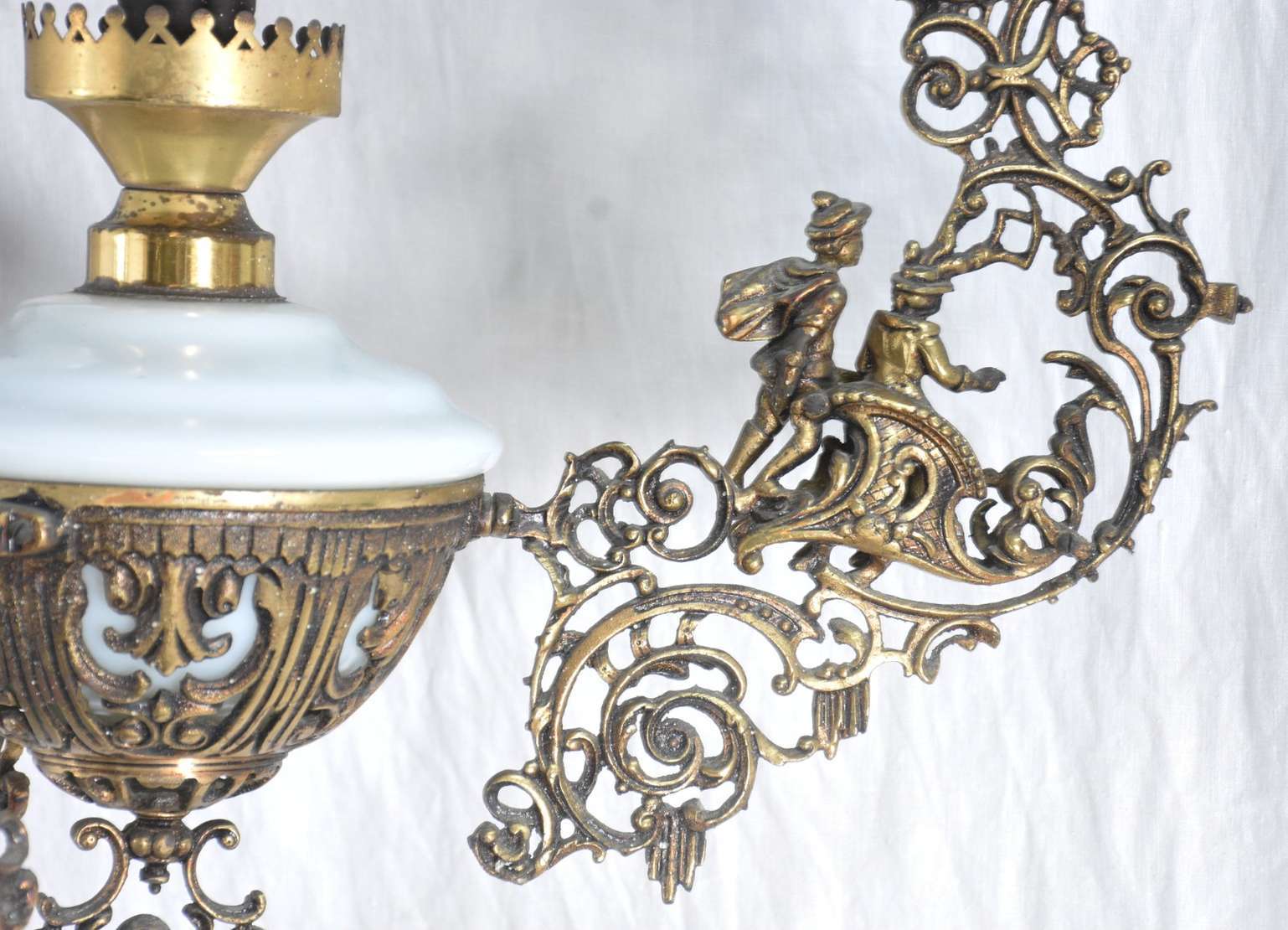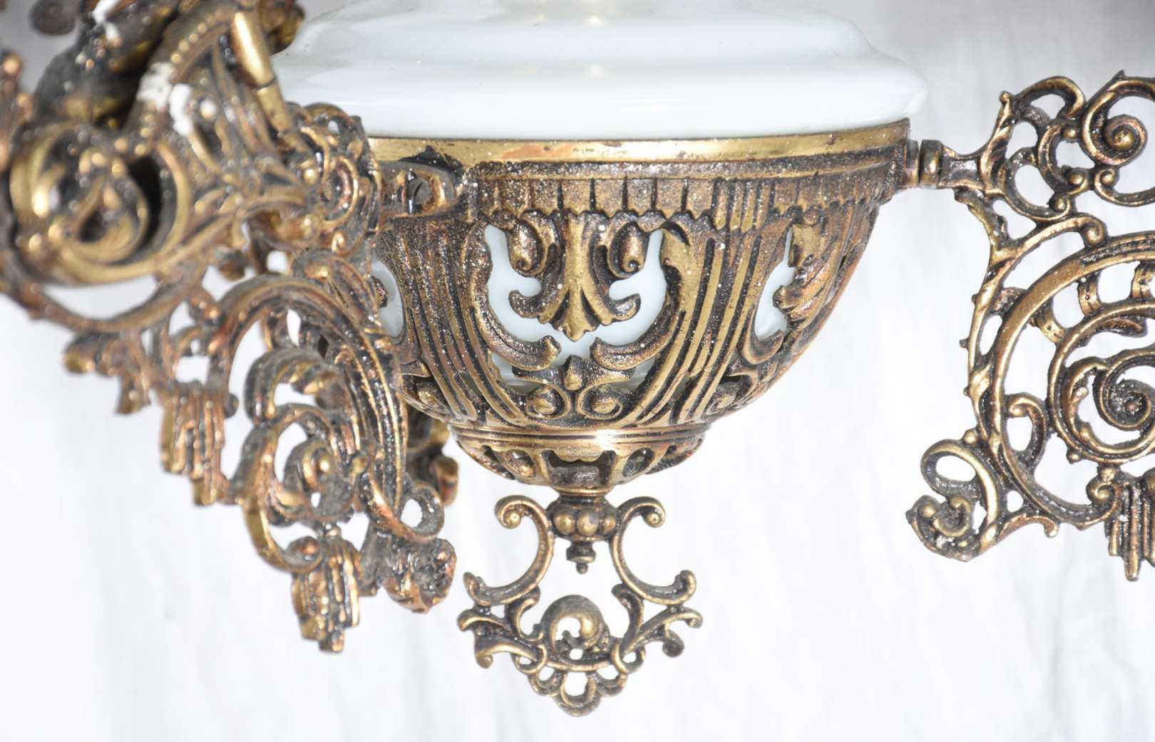 Lustre de cristal para 6 luzes, pingentes lapidados, cúpulas na forma de copos opalinados. Um dos braços colados.