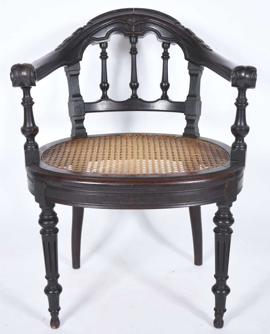 Sofá estilo francês de madeira nobre com entalhes, estofado e forrado com tecido em preto e branco com estampas de "D...