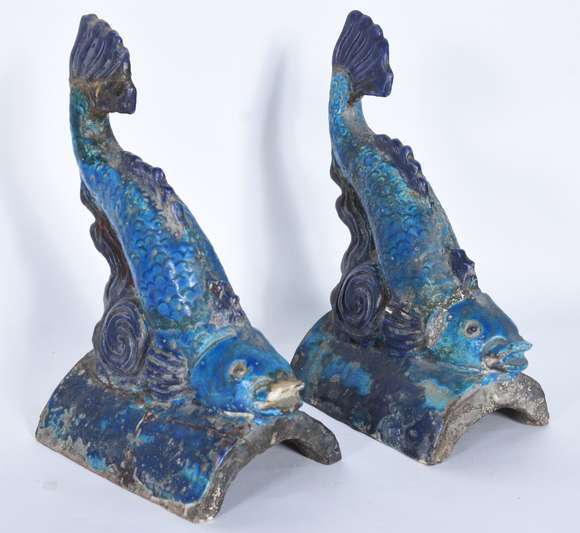 Par de telhas de cerâmica chinesa encimadas por figuras de peixes, século XVIII, uma quebrada e colada e pequenos las...