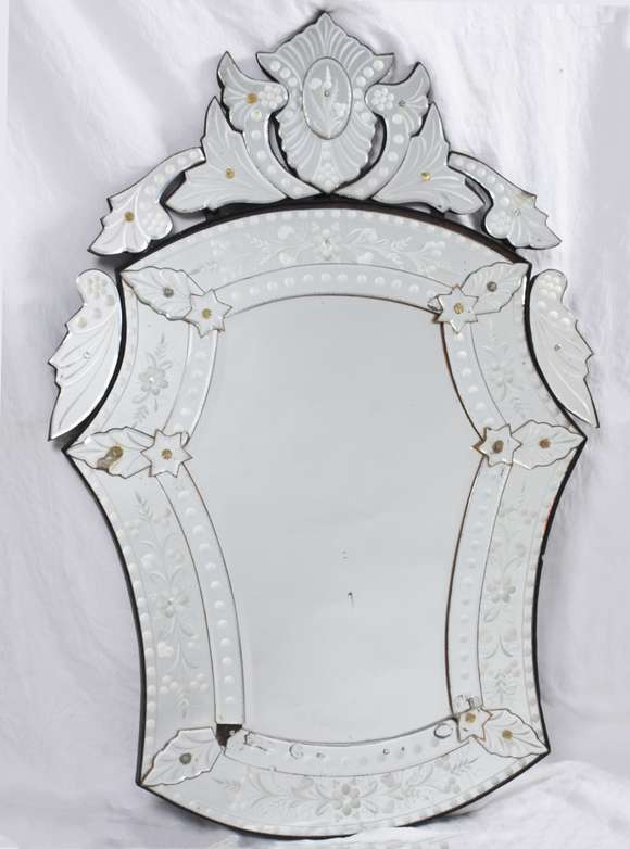 Espelho veneziano de cristal, moldura trabalhada. Faltando alguns parafusos e pequenos quebrados. Desgastes.
