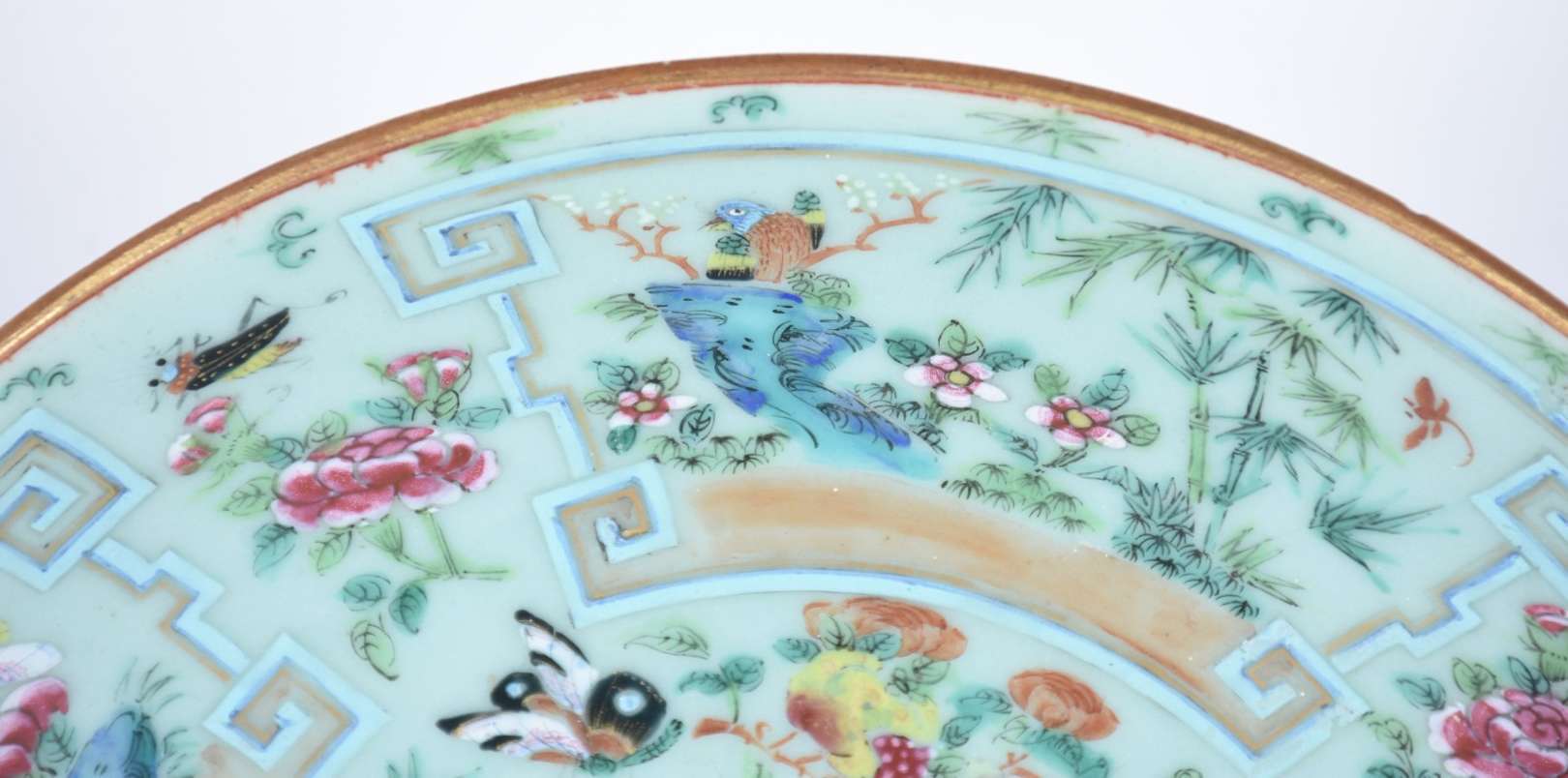 Caixa de madeira oriental decorada com pássaros em policromia. Partes descascando. No estado.