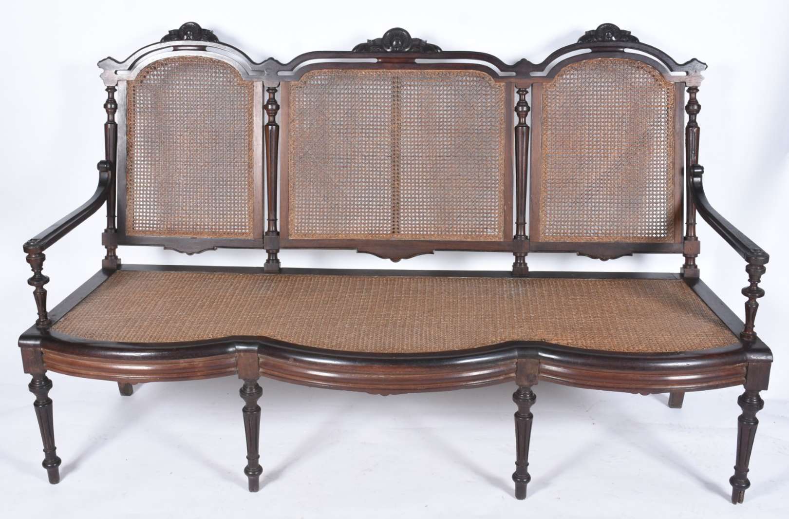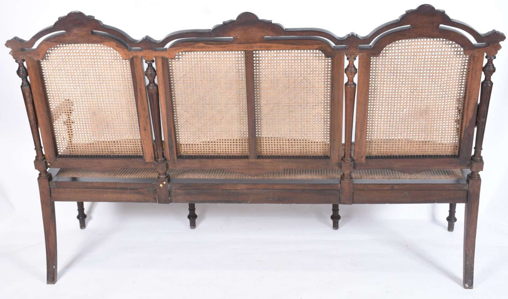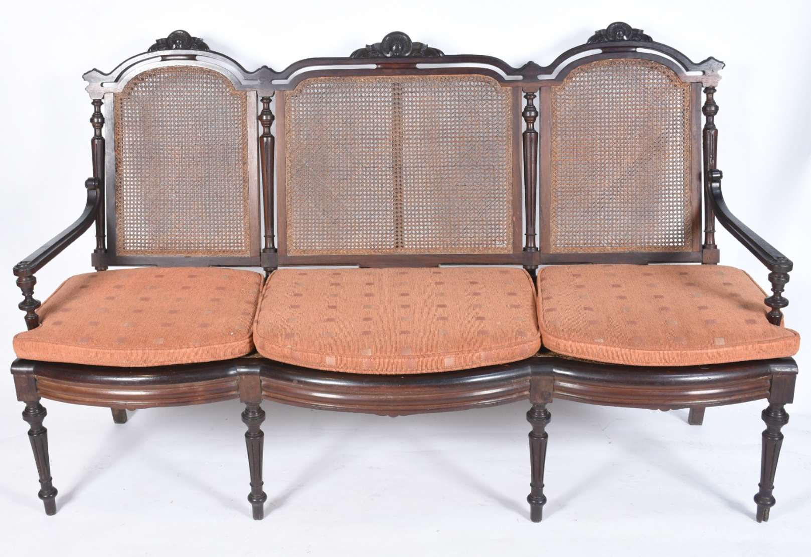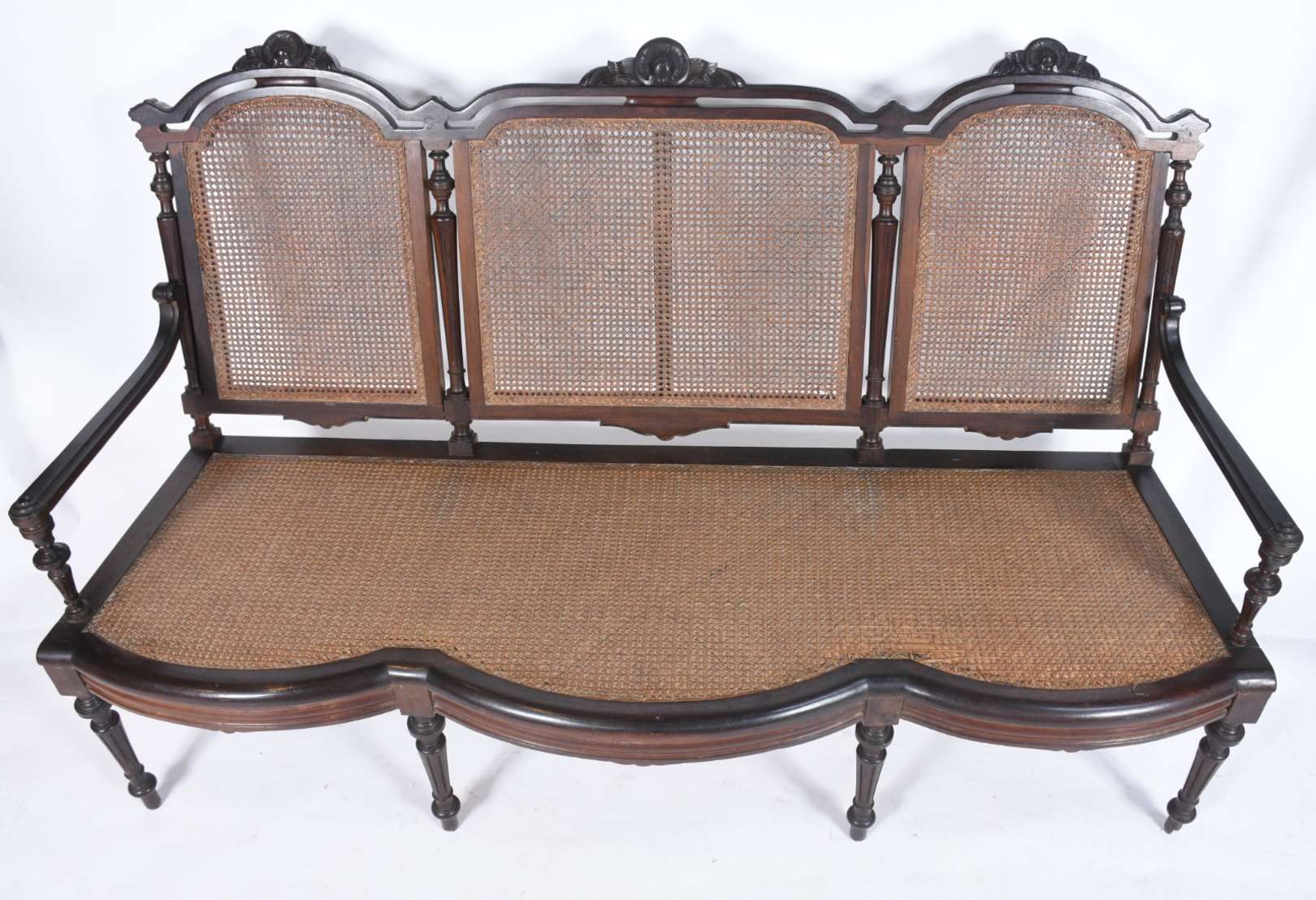 Bergere estofada e forrada com tecido na cor azul (desgastes).