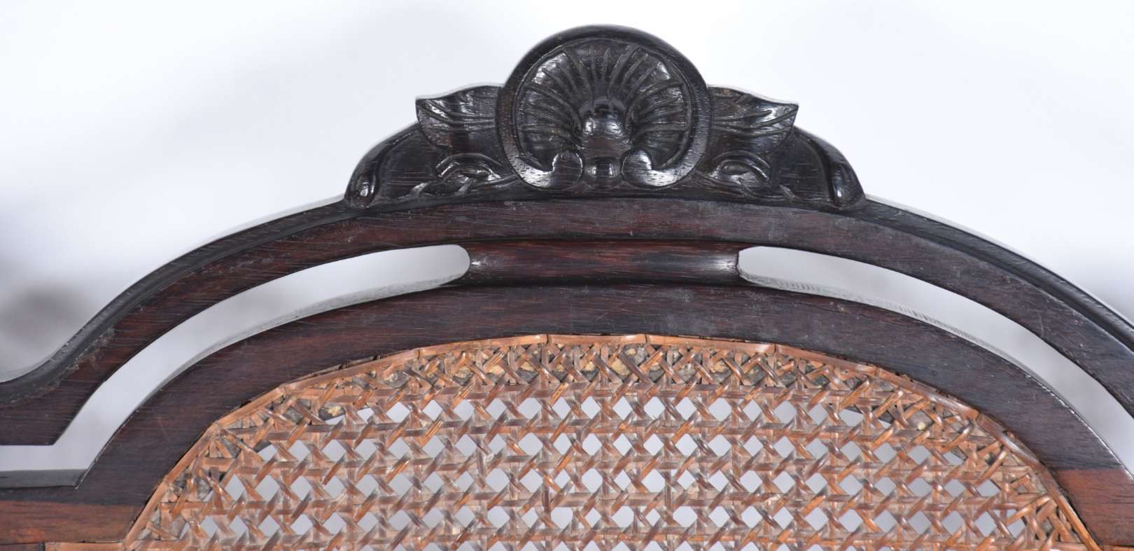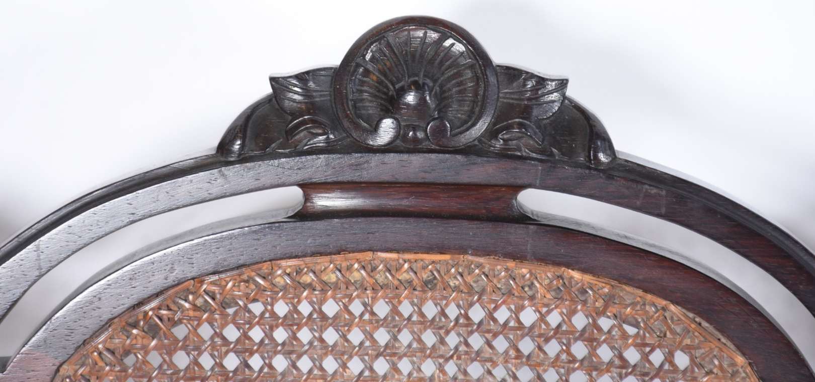 Cadeira de madeira nobre, encosto com traves verticais.