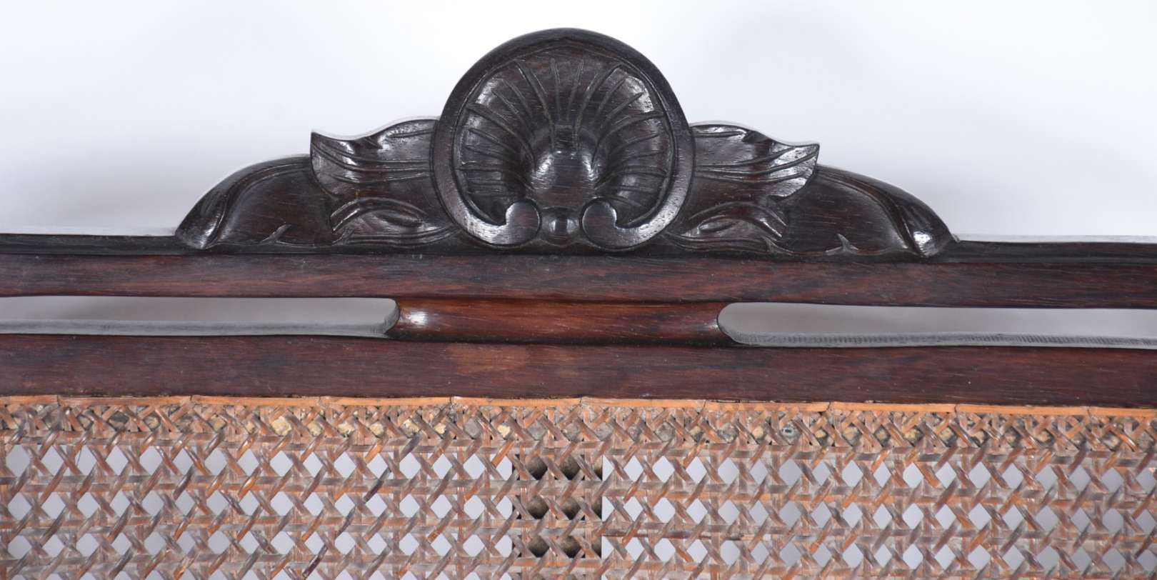 Par de camas de solteiro de madeira nobre, completas, com laterais e estrados. Desgastes. (uma das camas precisando ...