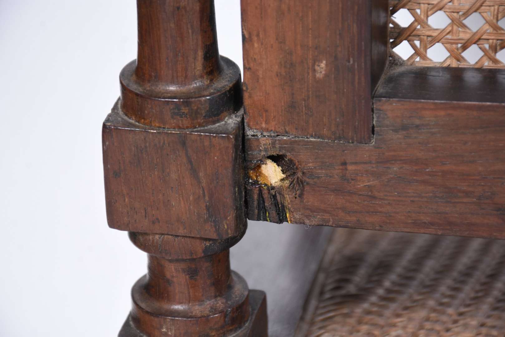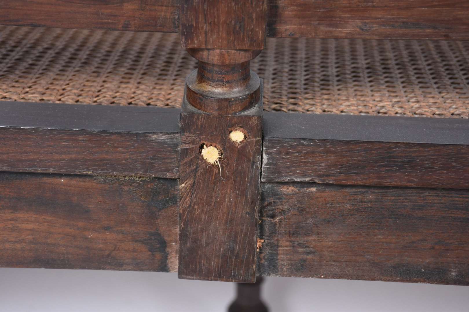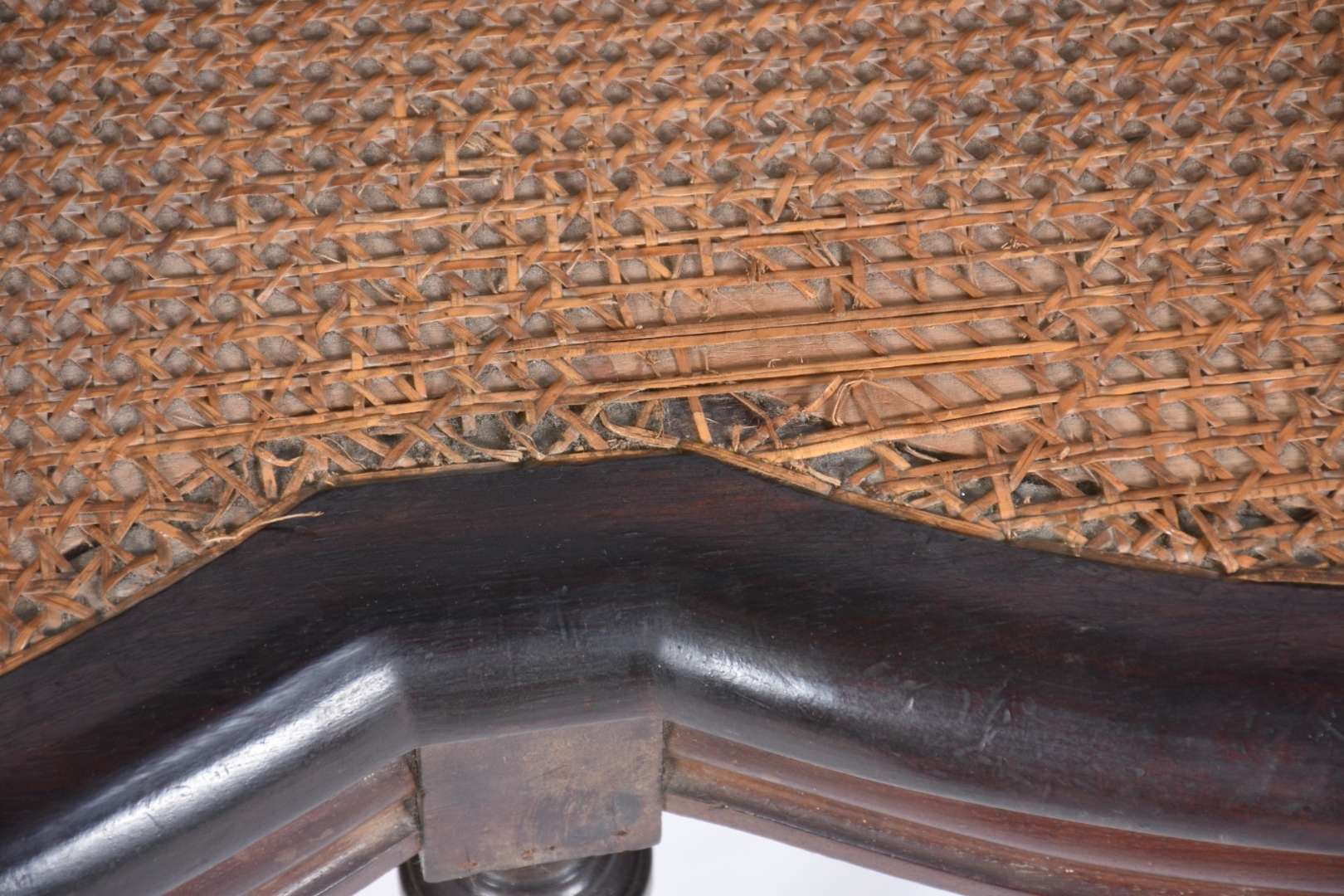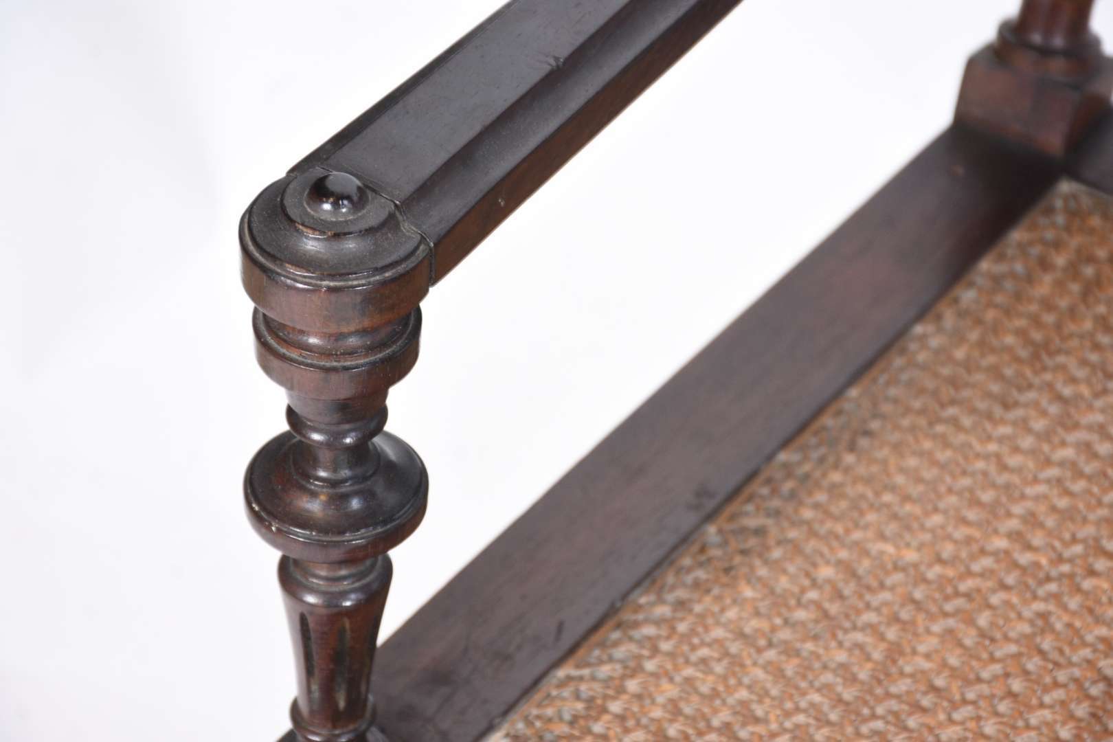 Cadeira baixa para calçar botas, de madeira nobre, assento estofado com tecido bege e tacheados, encosto de palhinha.