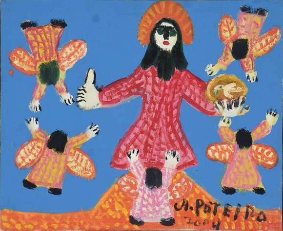 Moldura de madeira na forma de "Sol" com pátina dourada, estampa de figura feminina ao centro.