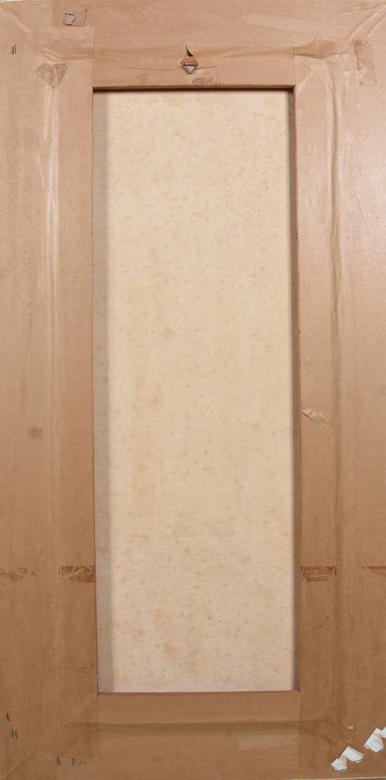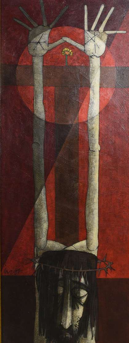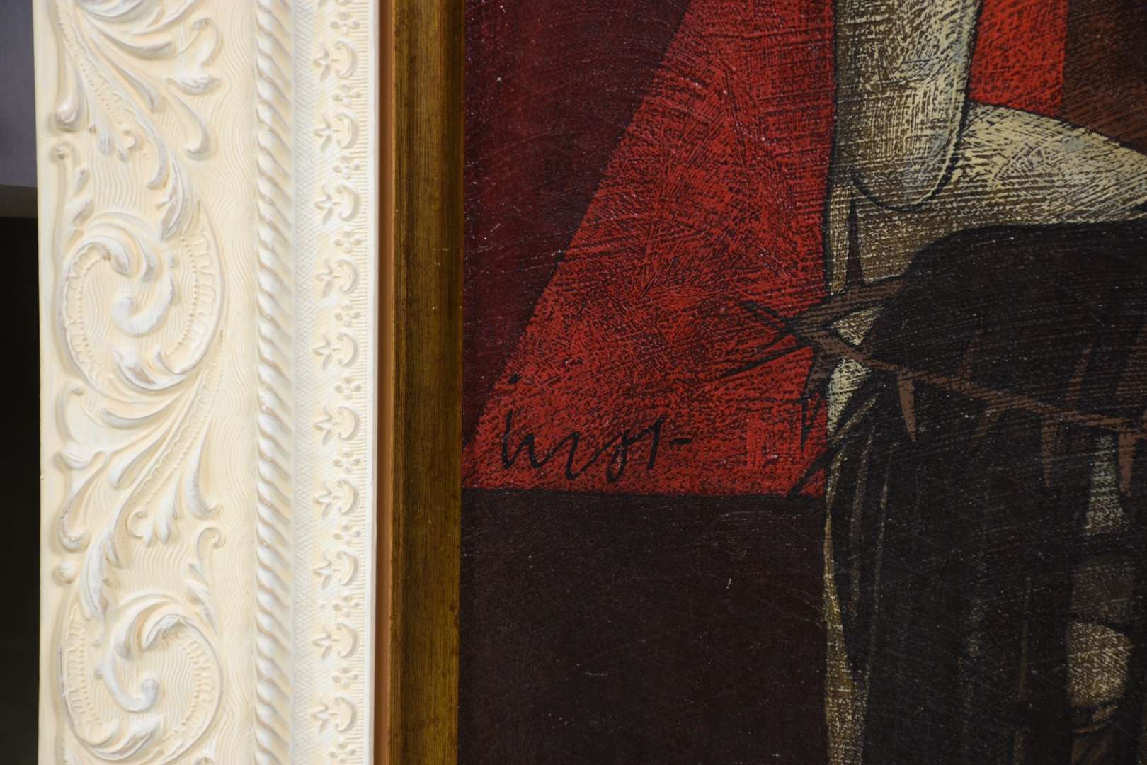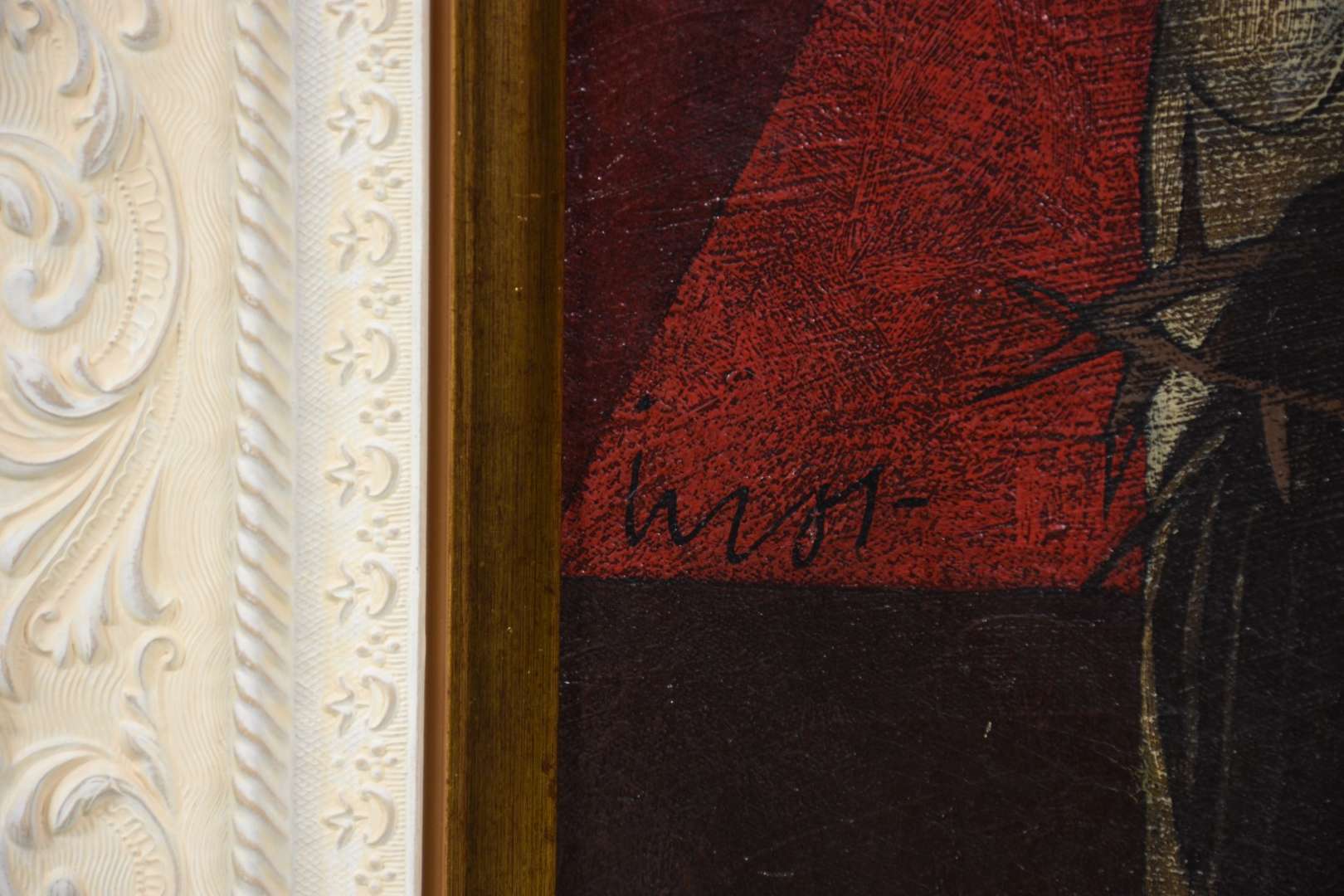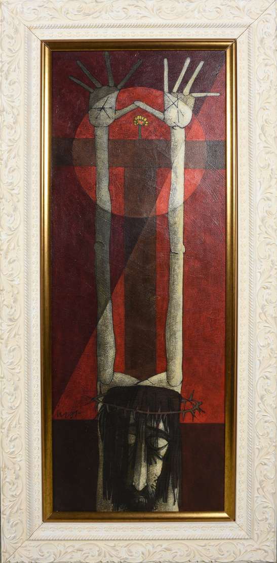 Moldura de madeira na forma de "Sol" com pátina dourada, estampa de figura feminina ao centro.