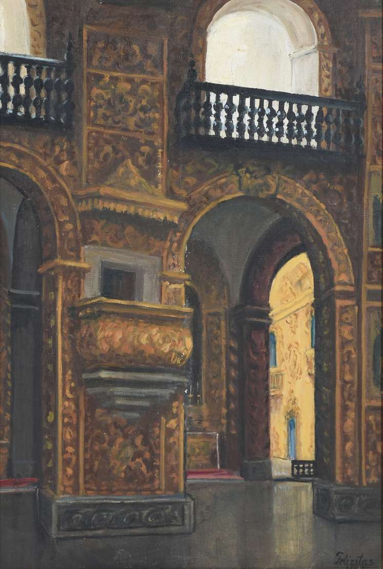 Moldura de madeira na forma de "Sol" com pátina dourada, estampa de figura feminina ao centro.