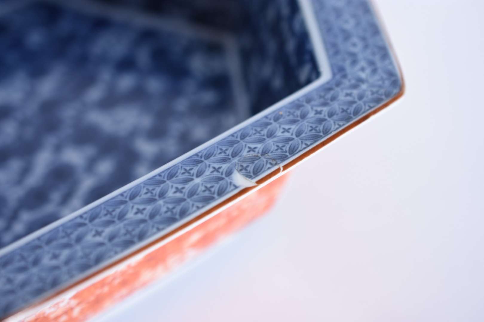 Caixa de madeira oriental decorada com pássaros em policromia. Partes descascando. No estado.