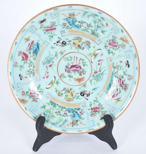 Antigo prato de porcelana oriental com esmaltes da Família Verde.