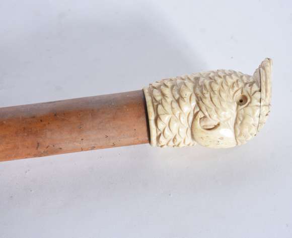Guarda chuva com cabo de madeira e castão de osso entalhado na forma de cabeça de pássaro.