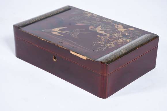 Caixa de madeira oriental decorada com pássaros em policromia. Partes descascando. No estado.
