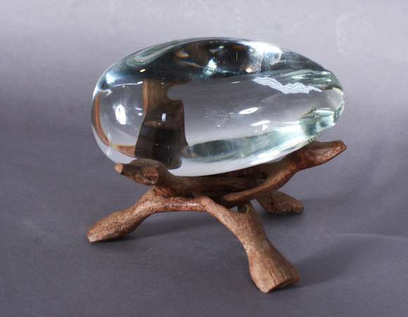 Peso de papel de cristal, assinado. Acompanha suporte de madeira.