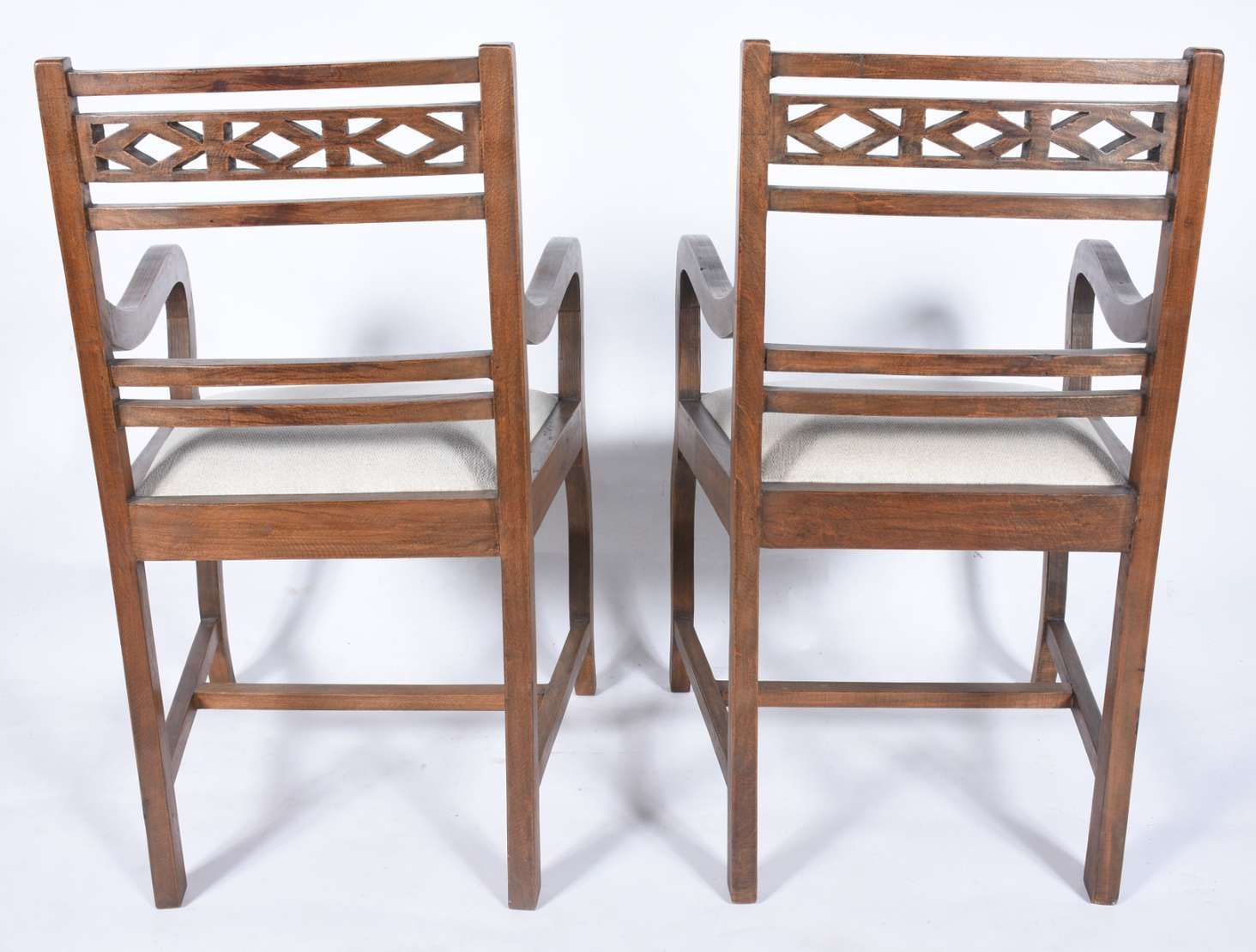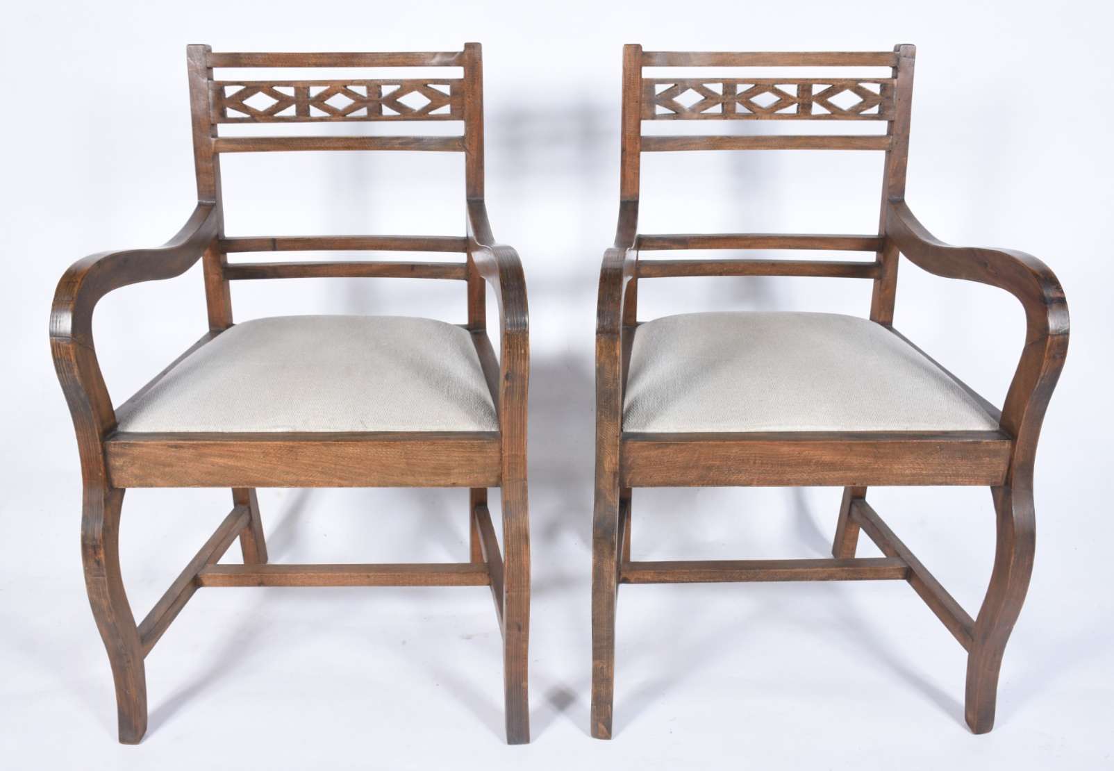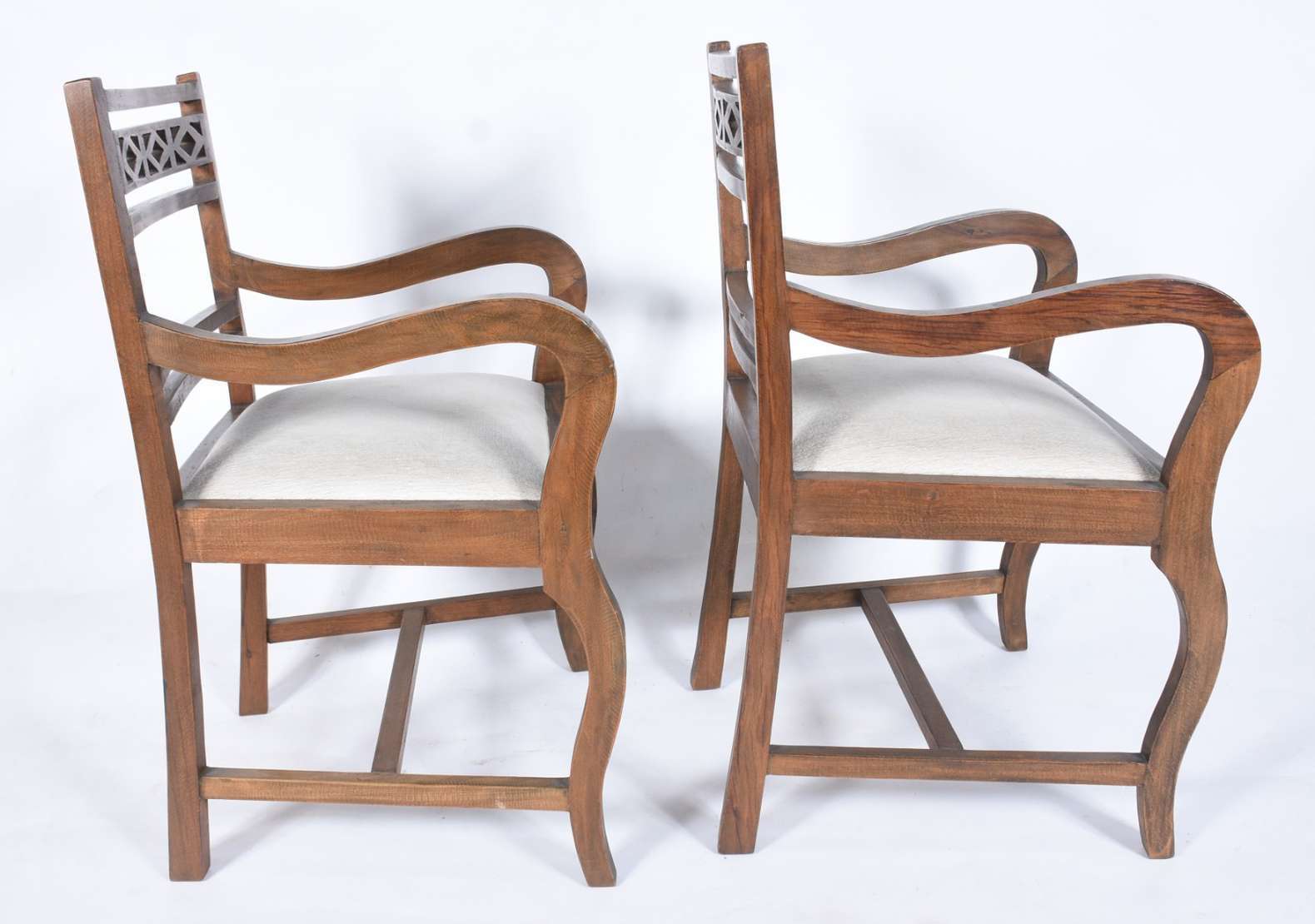 Par de camas de solteiro de madeira nobre, completas, com laterais e estrados. Desgastes. (uma das camas precisando ...
