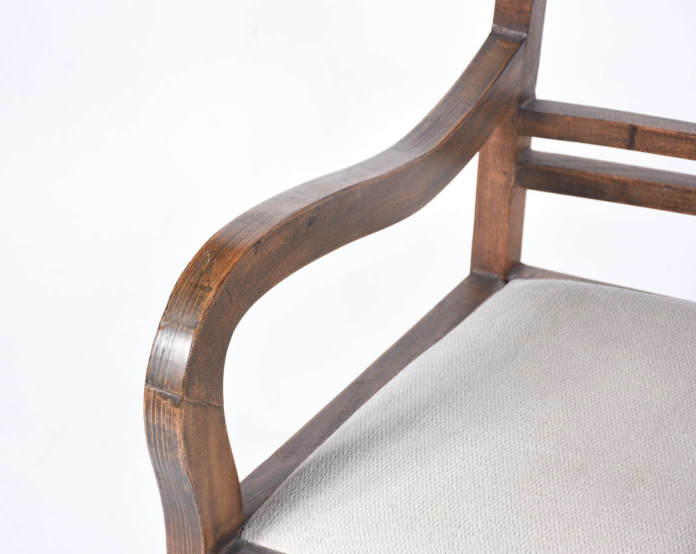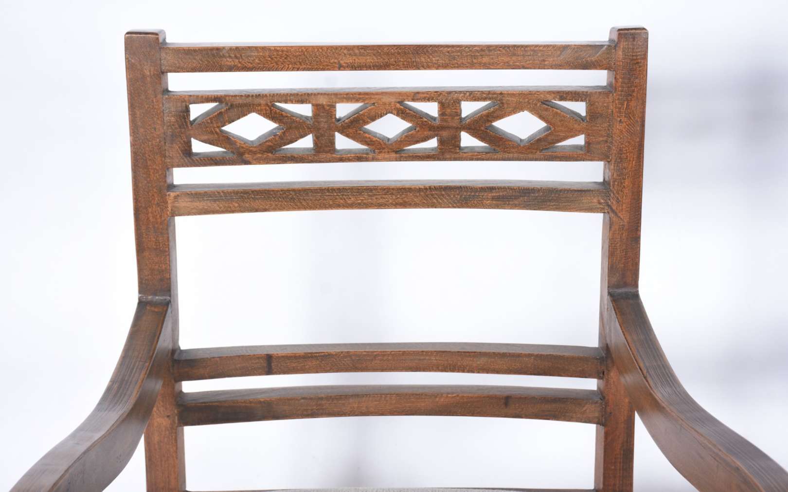 Cadeira baixa para calçar botas, de madeira nobre, assento estofado com tecido bege e tacheados, encosto de palhinha.