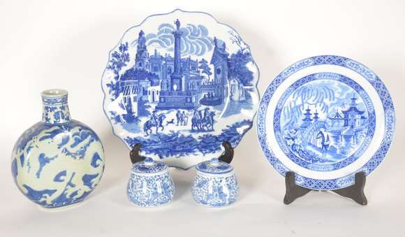 Cinco peças diversas de porcelana azul e branca, sendo: 2 pratos, 2 pequenas potiches e vaso.