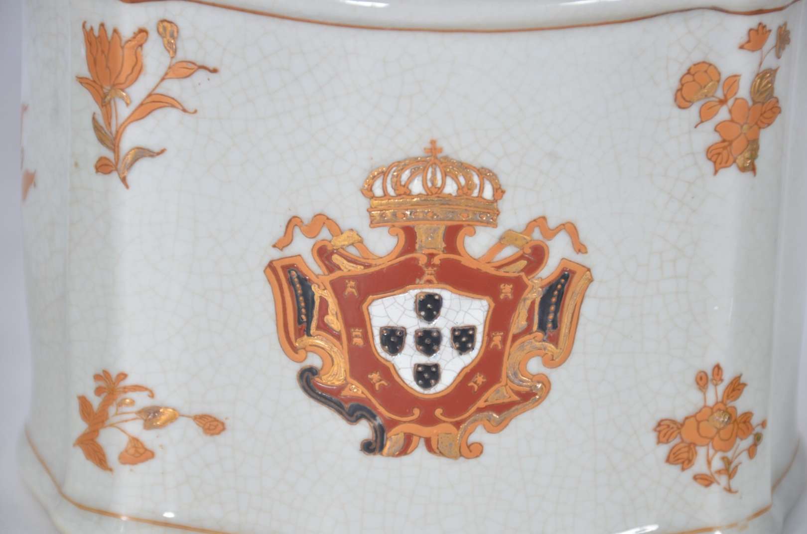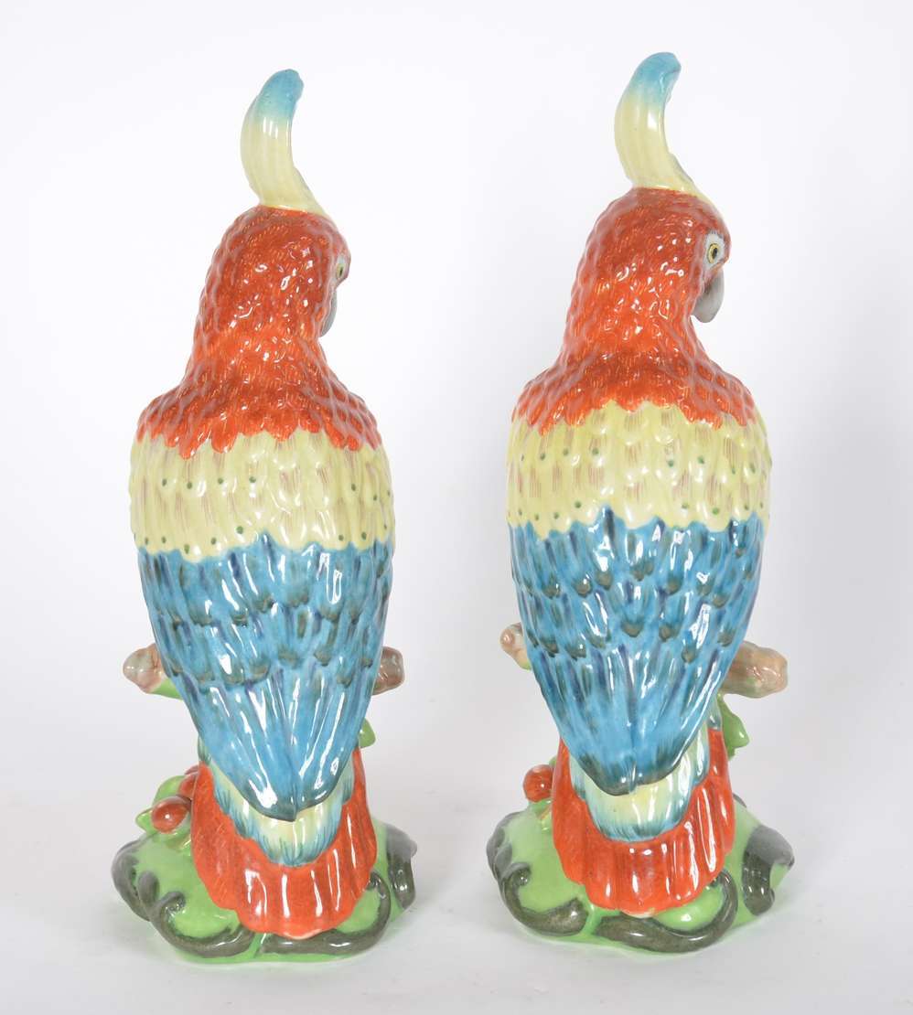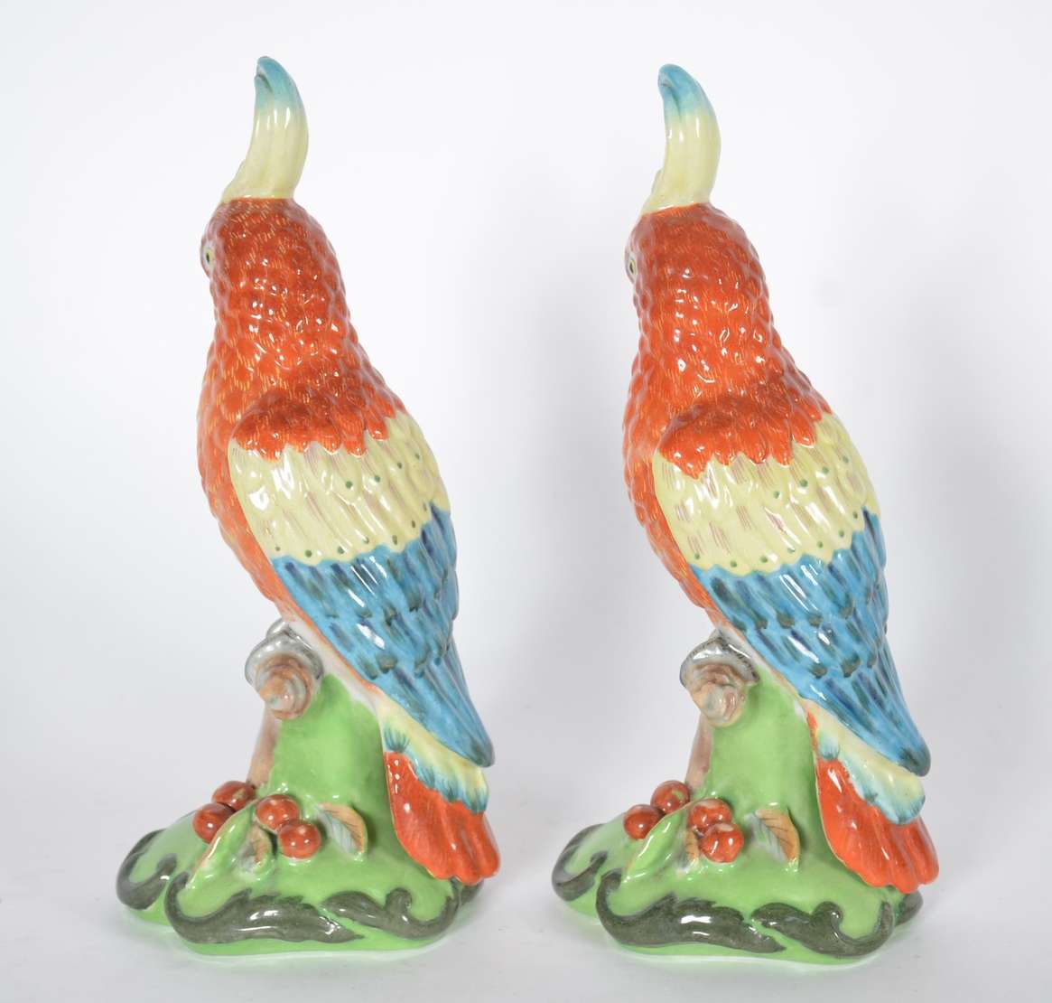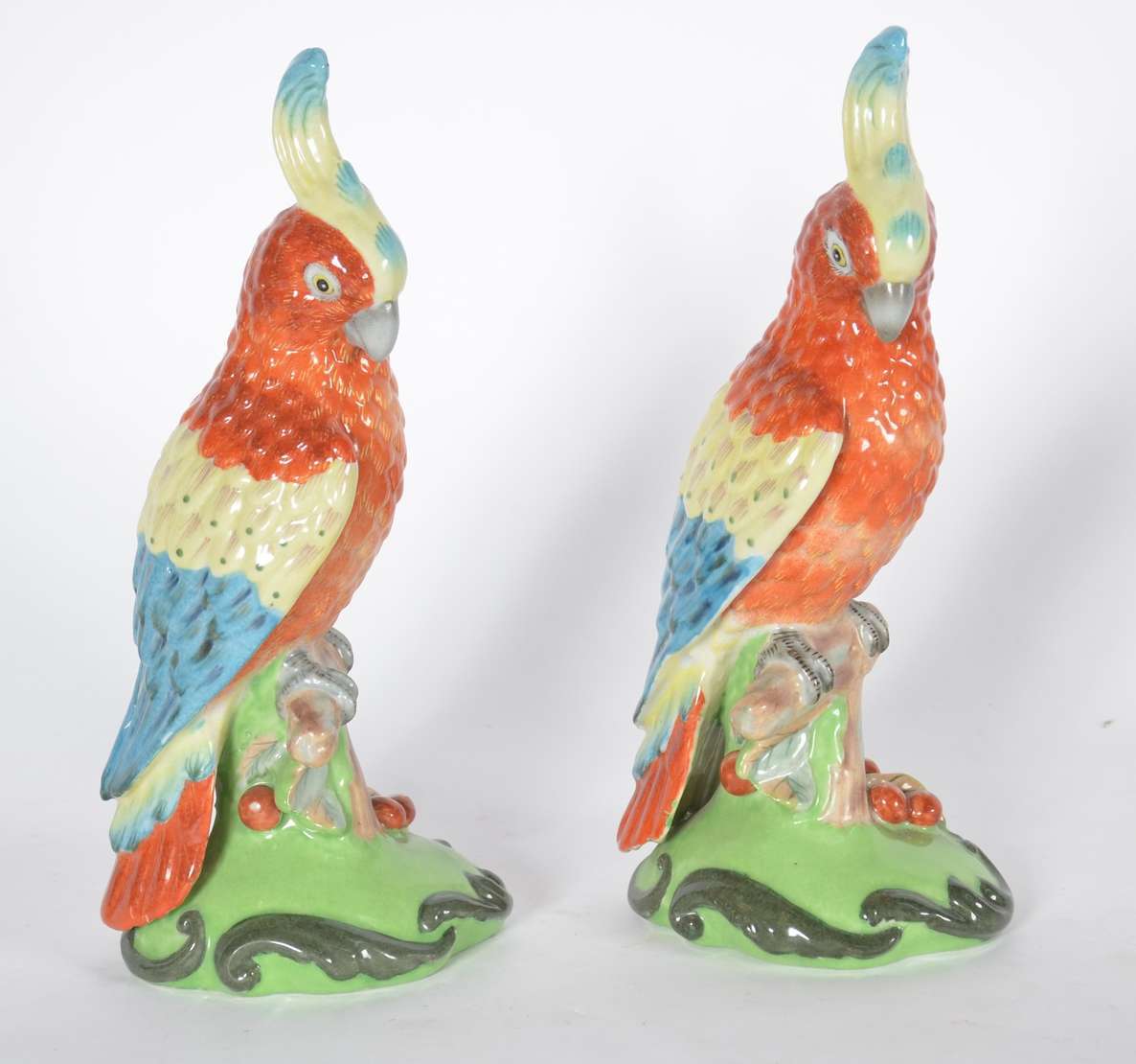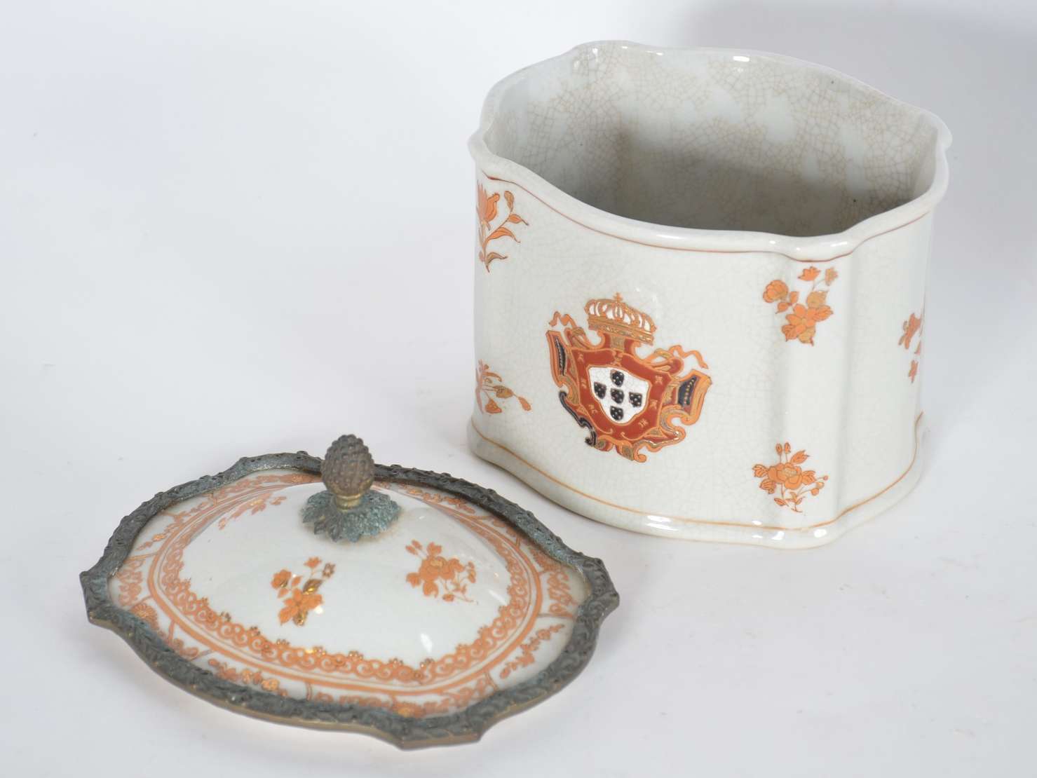 Tres peças de porcelana policromada, sendo par de papagaios e caixa decorada com brazões.