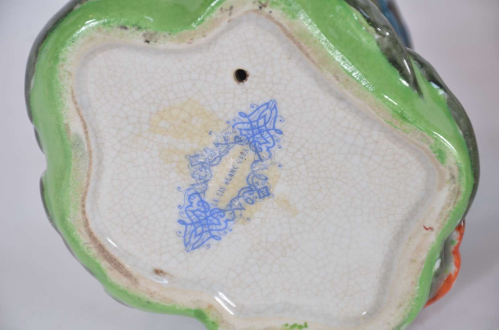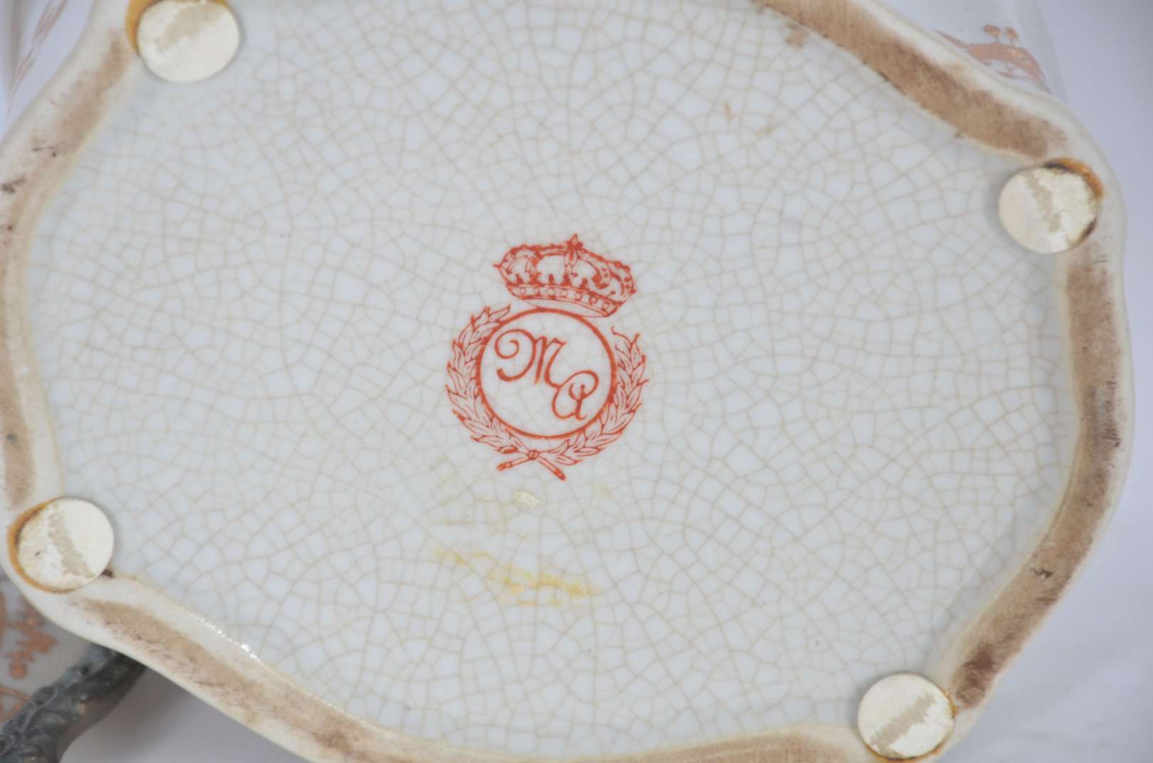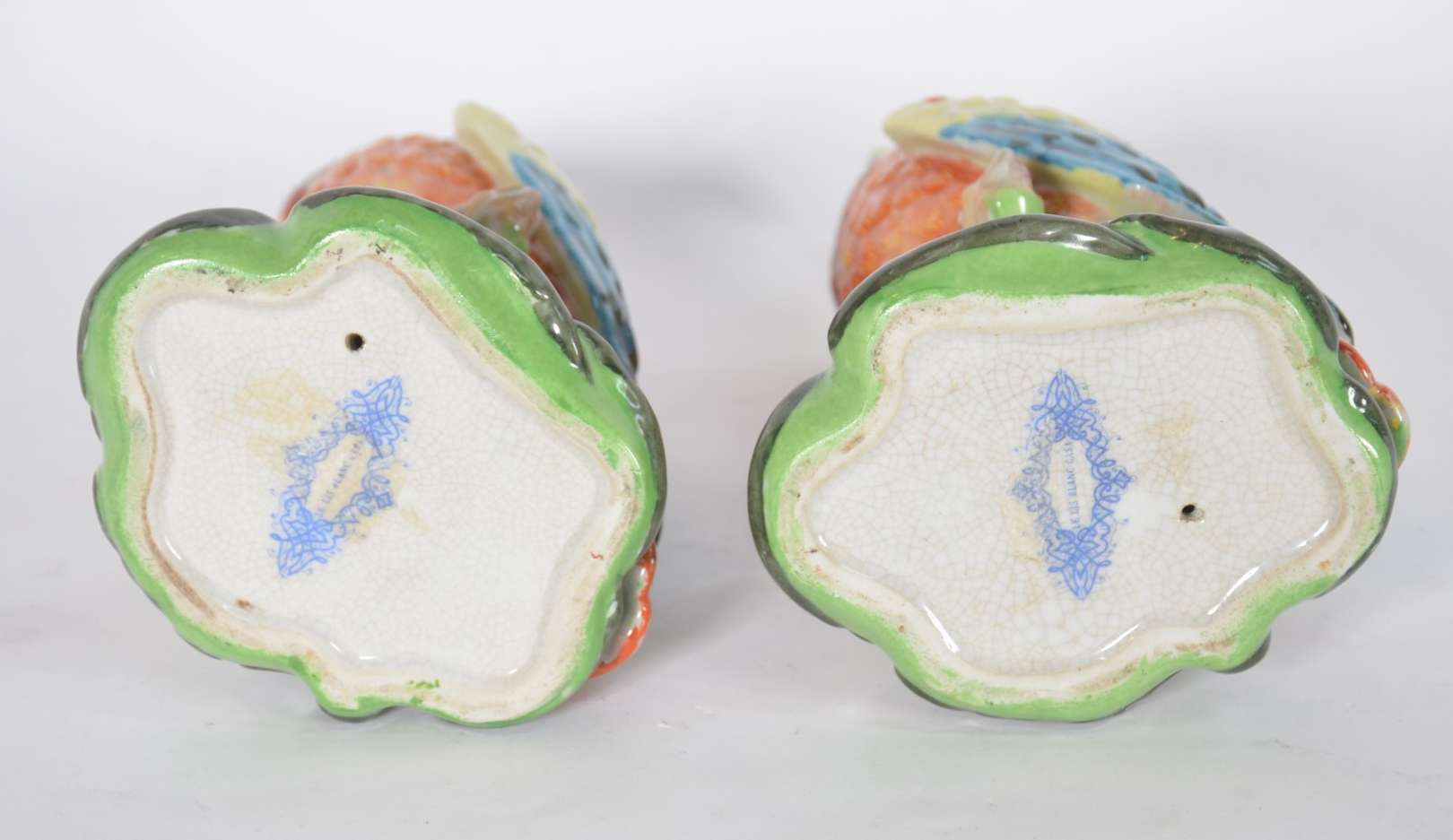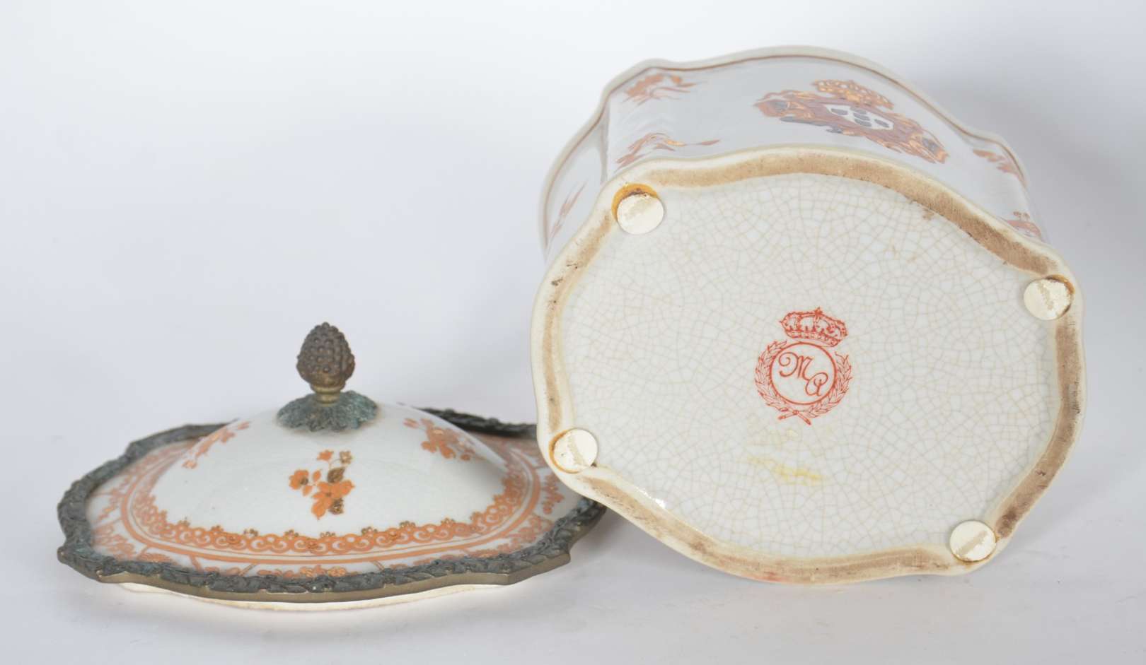 Tres peças de porcelana policromada, sendo par de papagaios e caixa decorada com brazões.