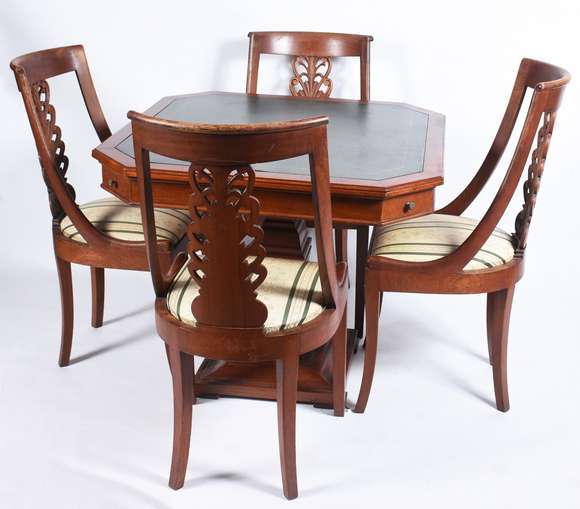 Mesa de jogo de madeira nobre, quinas chanfradas com pequenas gavetas, apoio em coluna central terminando em platô qu...