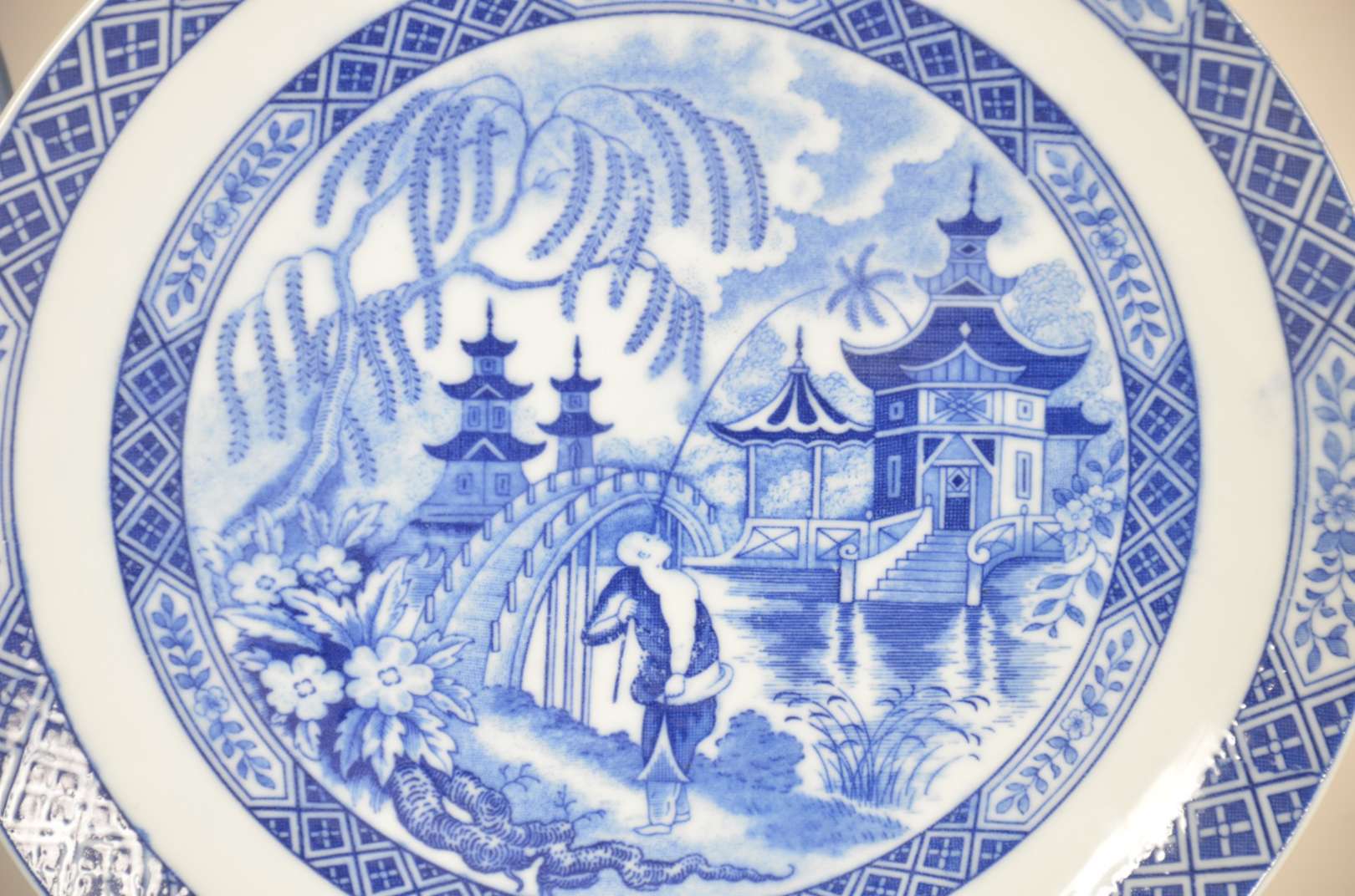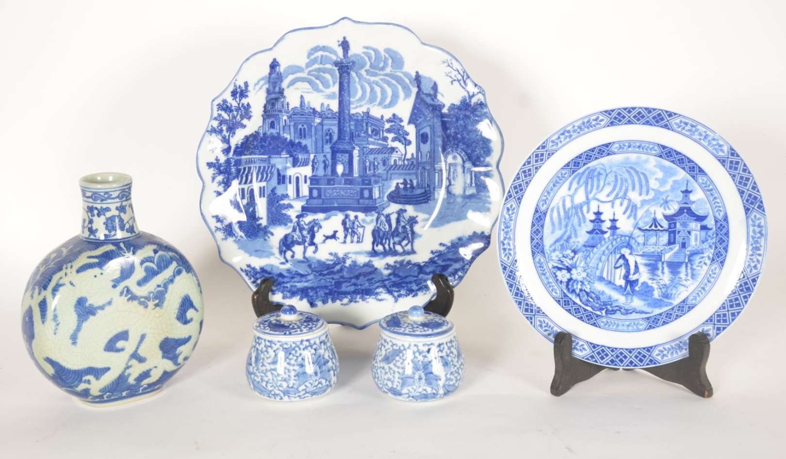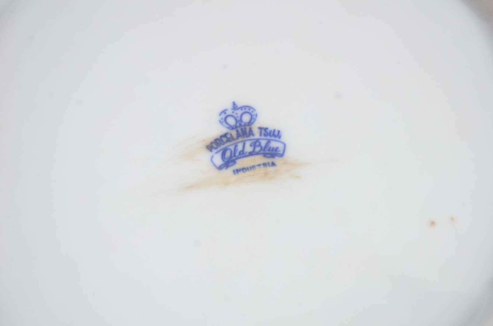 Quinze peças diversas de porcelana oriental, sendo: 9 pratos de sobremesa com pagodes em azul e branco; par de estatu...