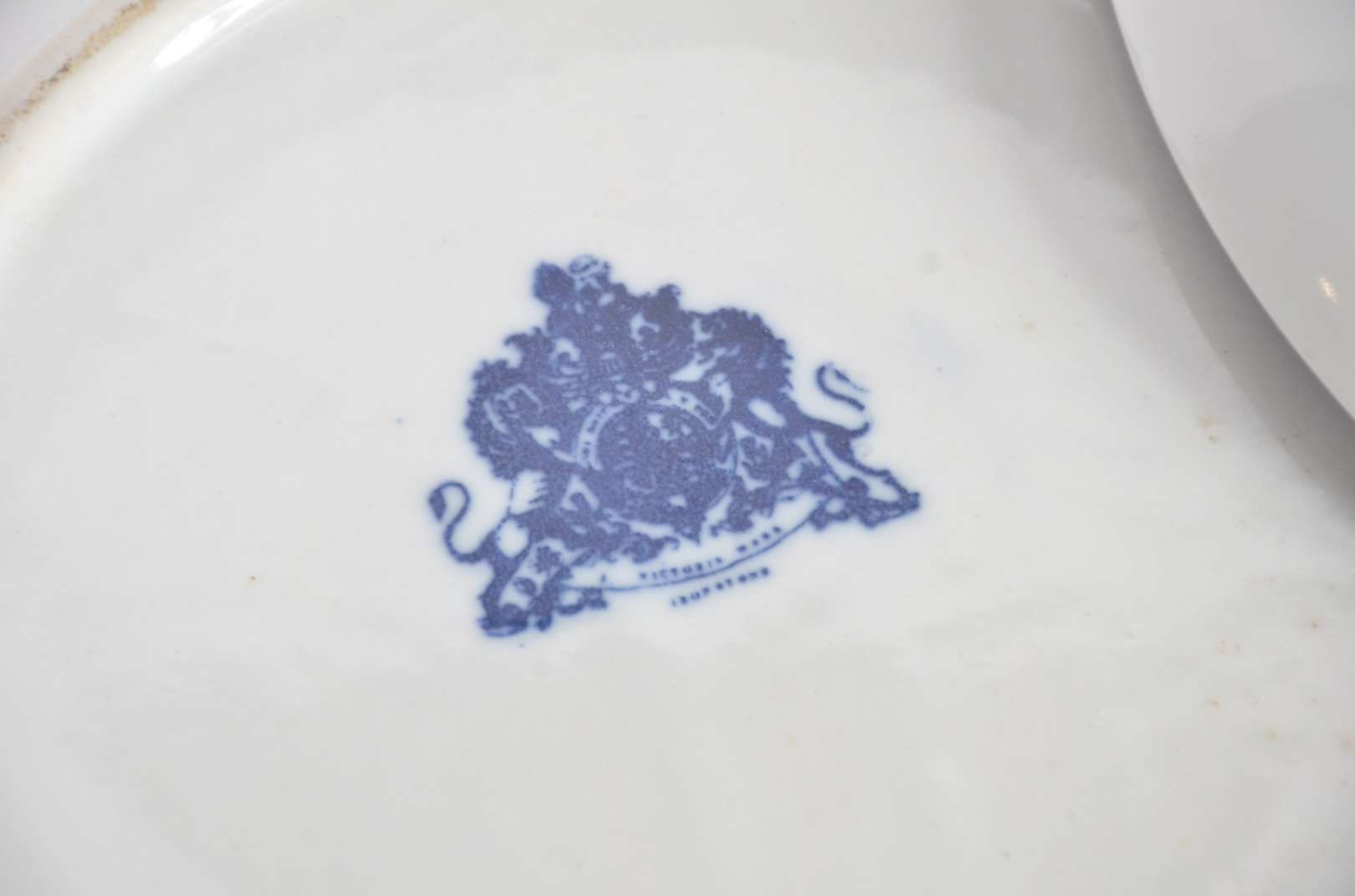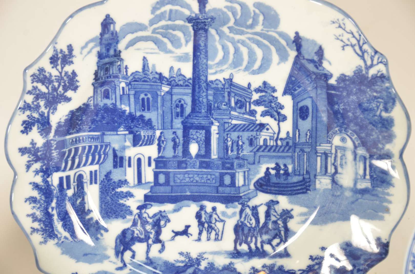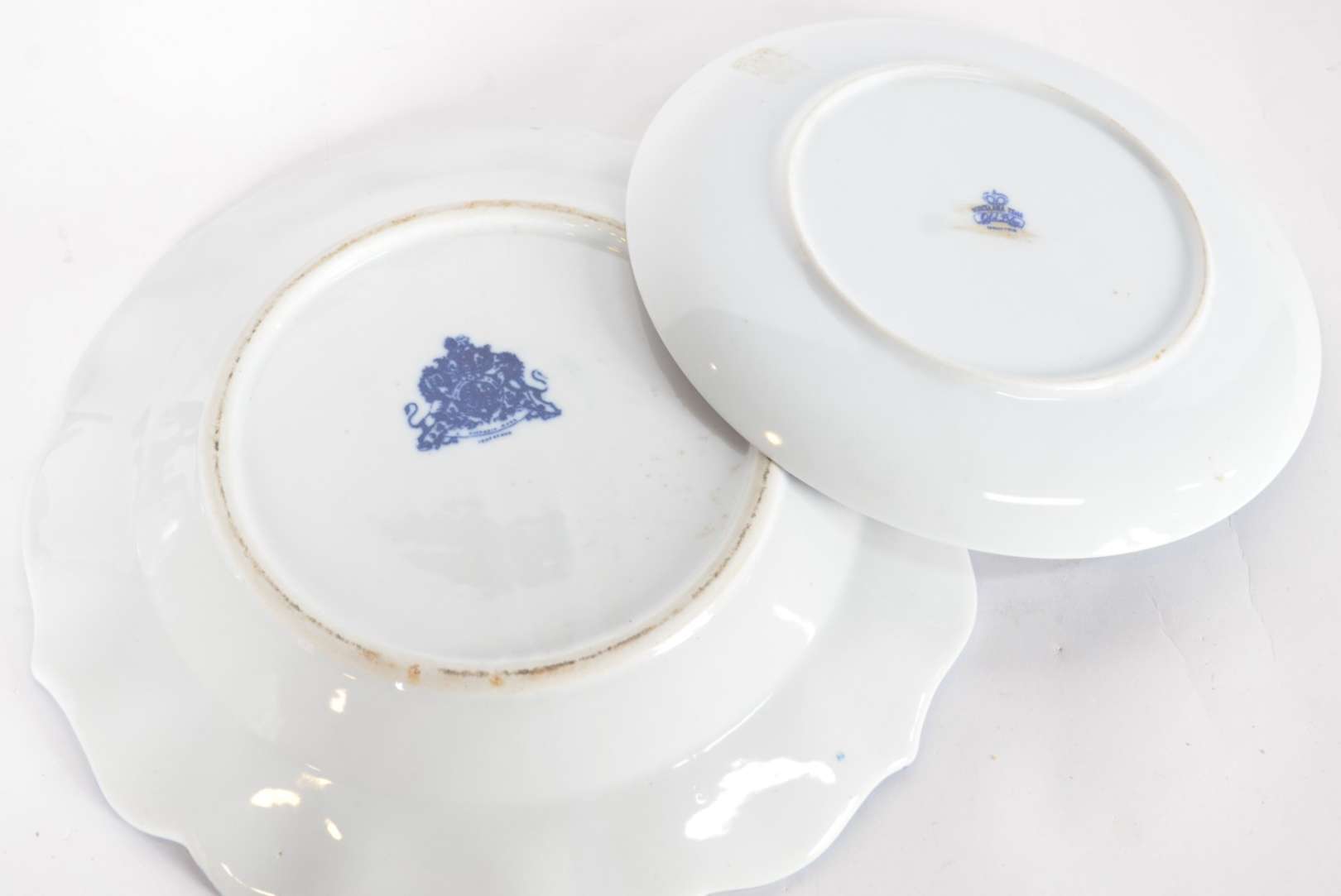 Quinze peças diversas de porcelana oriental, sendo: 9 pratos de sobremesa com pagodes em azul e branco; par de estatu...