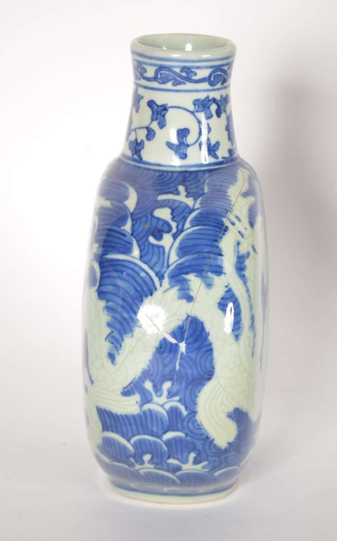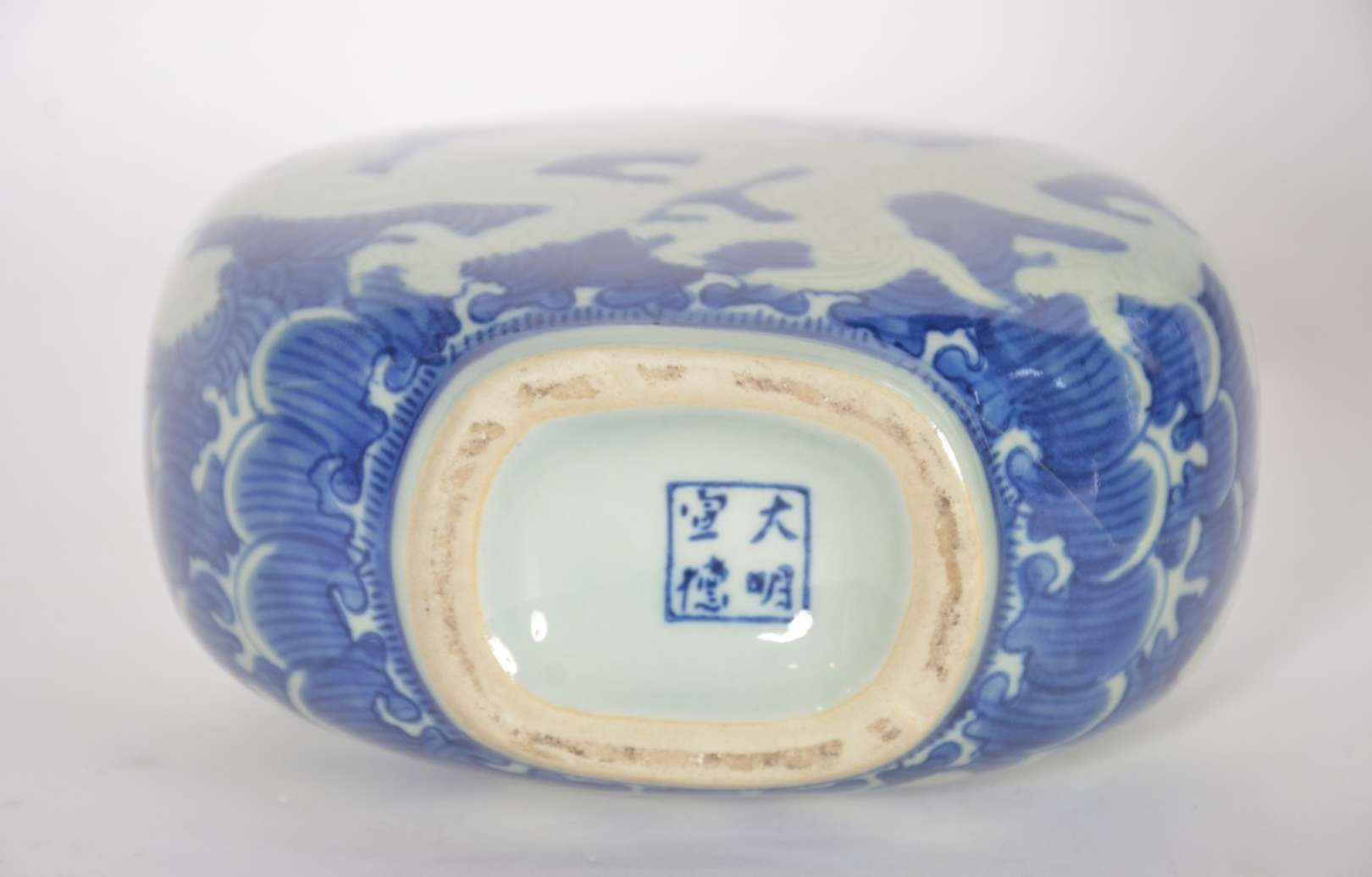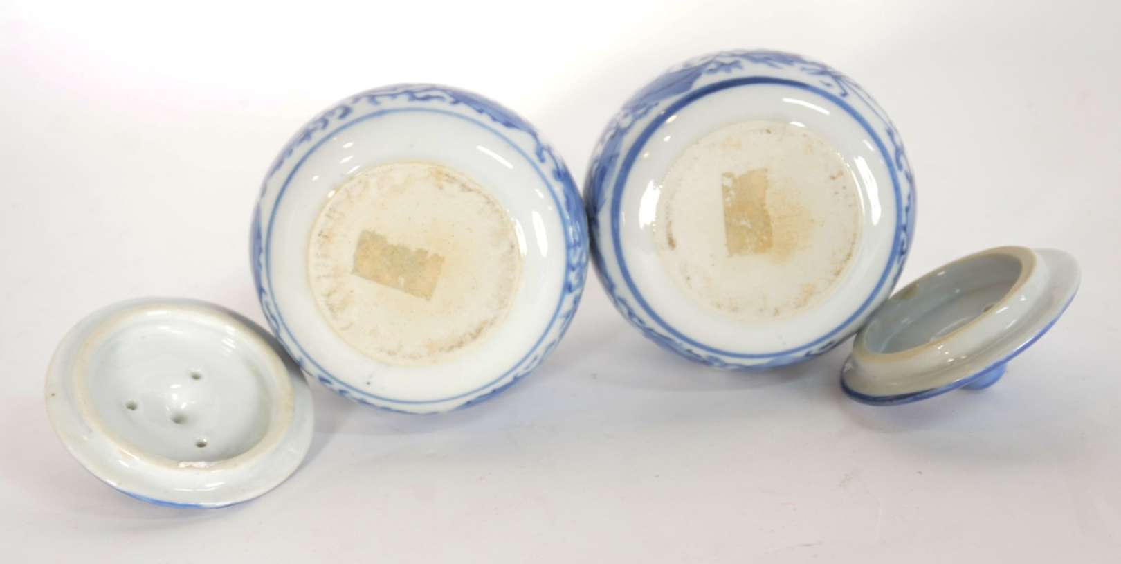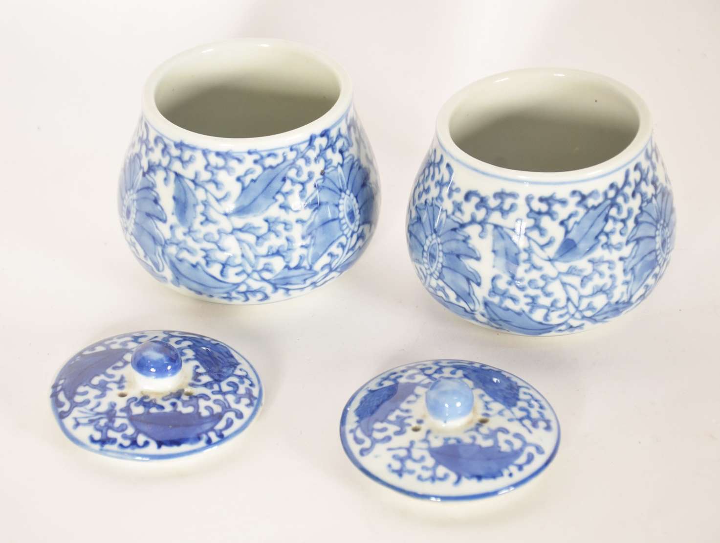Cinco peças de porcelana azul e branca, sendo: 3 caixas para chá e par de vasos.