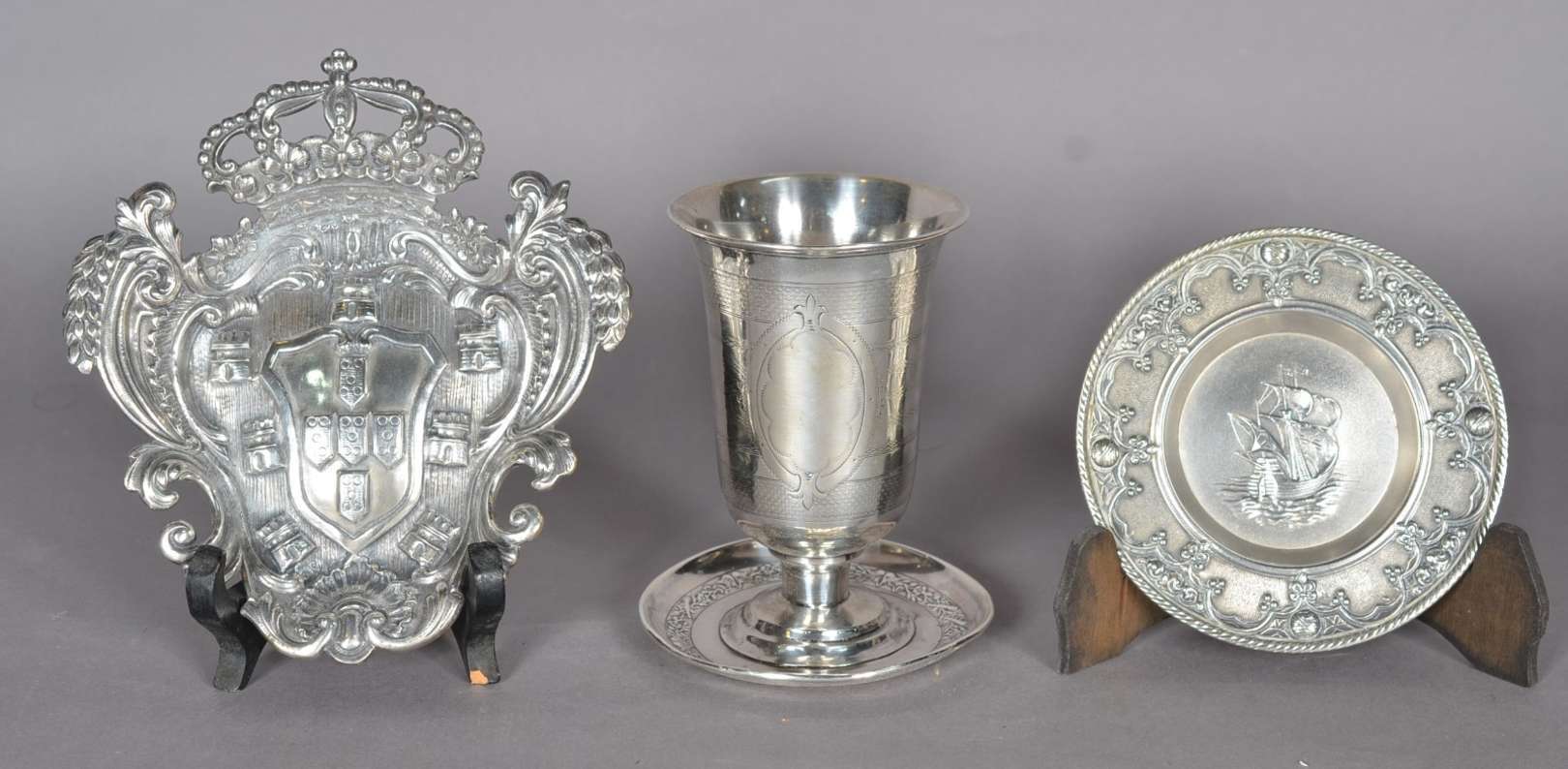 Três peças diversas, sendo: fruteira de cerâmica branca com base na forma de 3 figuras de metal dourado, e par de sab...