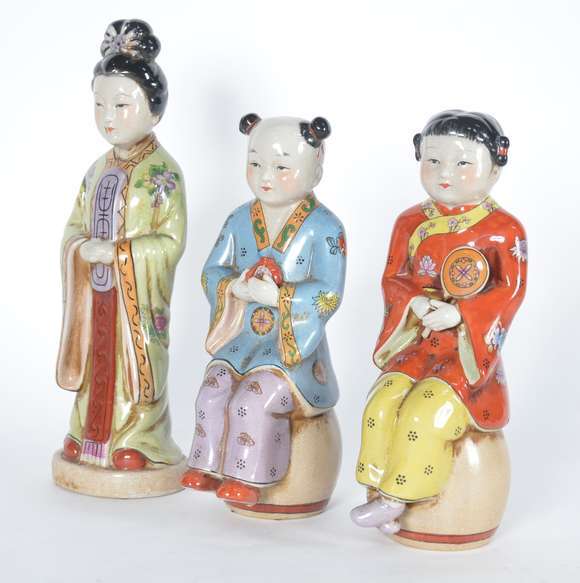 Três estatuetas de porcelana oriental policromada, representando Mãe e filhos.
