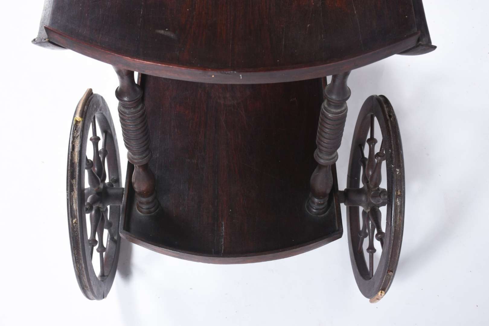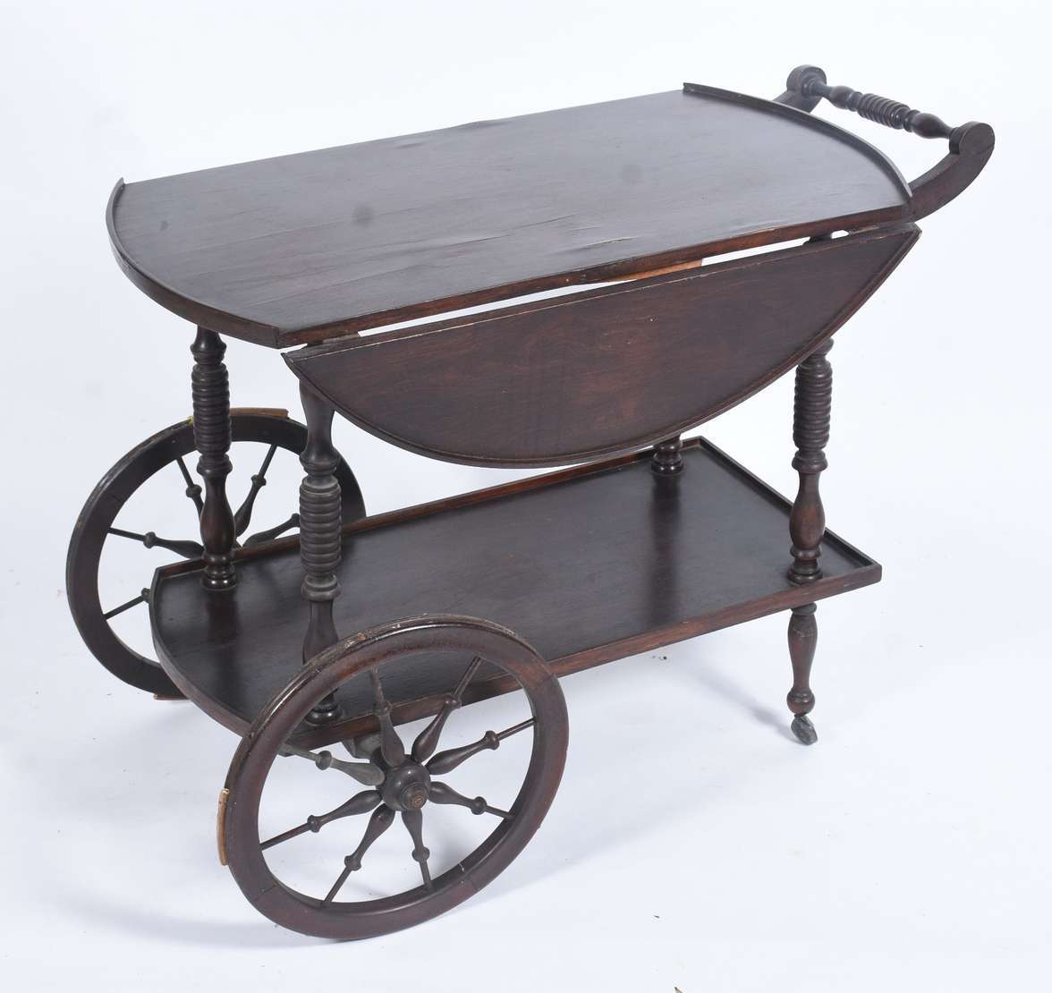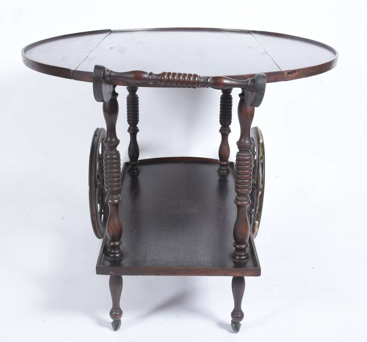 Carrinho de chá de madeira nobre, abas laterais, gradinha de metal dourado, sobre rodízios.